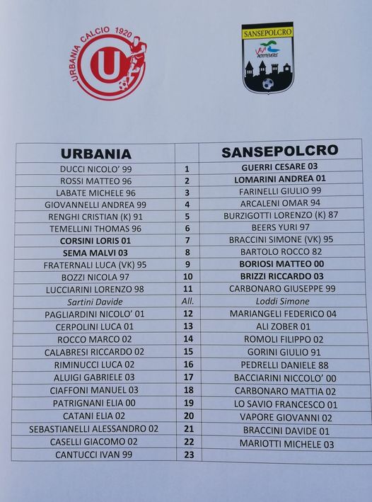 Sansepolcro fermato dall’Urbania che vince, come abbiamo riportato ieri, l’allenamento congiunto, 4-2.: Braccini, Brozzi, Braccini su rigore, Rossi per il 2-2 del primo tempo, quindi le reti marchigiane di Fraternali e Cantucci. Queste le due squadre al fischio d’inizio, dal profilo facebook dell’Urbania :