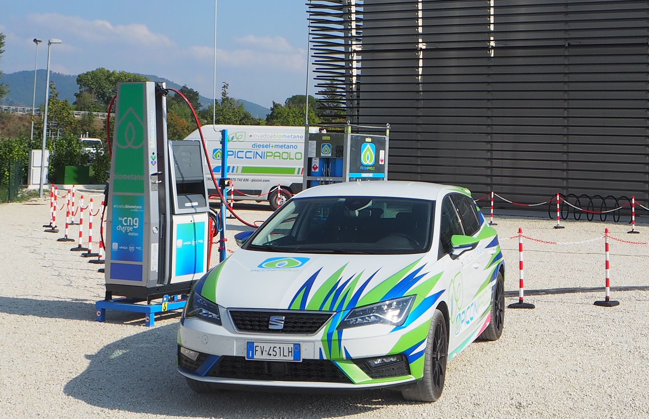 Nella foto: la Seat Leon a biometano di Piccini Paolo Spa – Scuderia Etruria Racing si rifornisce presso l’impianto mobile.