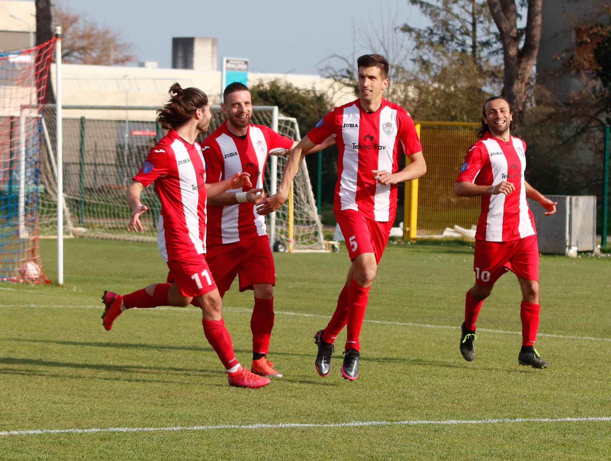 Nella foto tratta dal sito Fb della Società Tiferno, Gorini festeggiato dopo il primo goal quest’anno