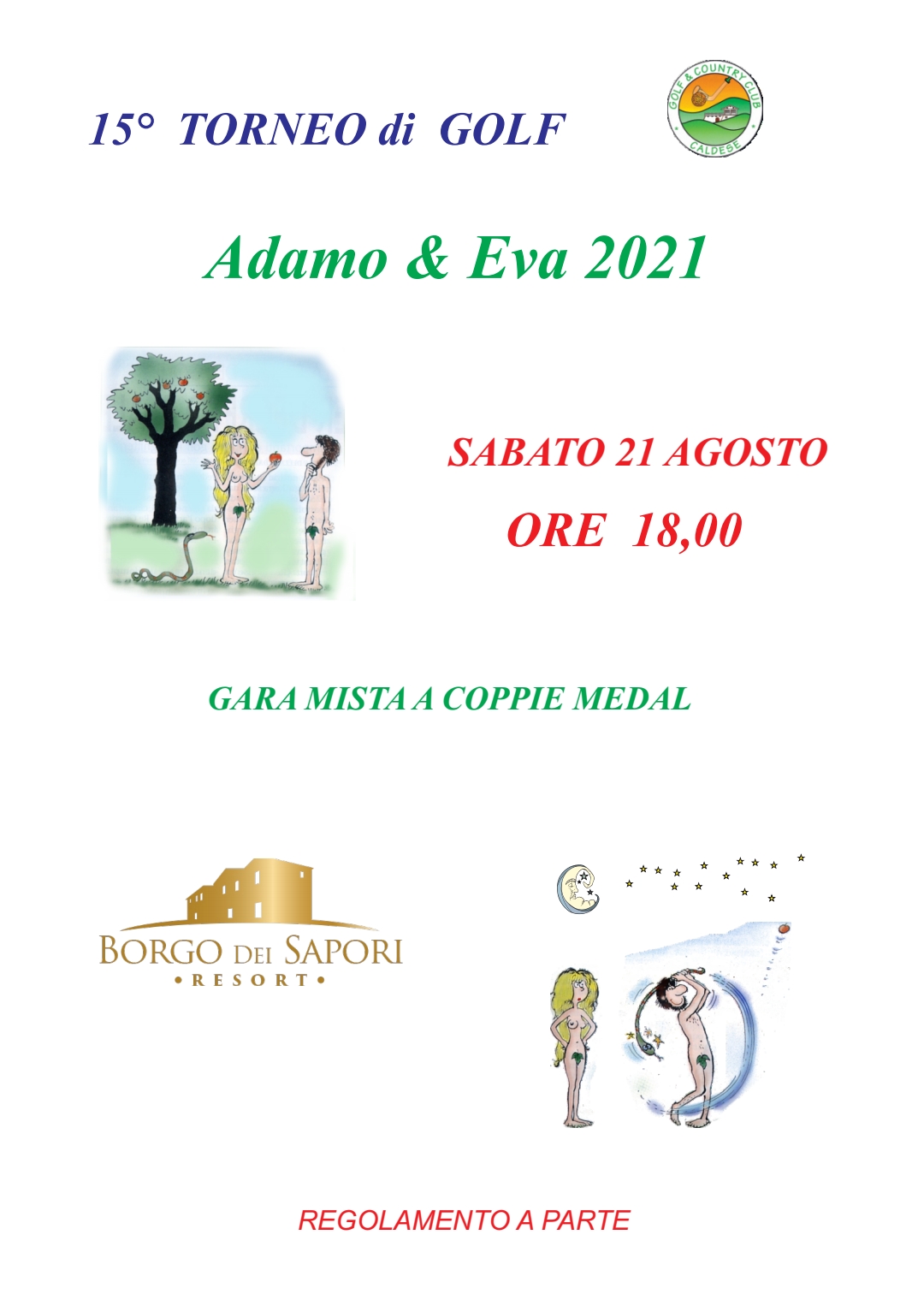 Riparte il golf a Caldese di Città di Castello. Dopo la pausa di qualche giorno il golf torna sui green di Caldese e la fa questa volta con la 15^ edizione di “Adamo ed Eva”, la gara a coppie miste, Medal, che si svolgerà sabato 21 agosto nel tardo pomeriggio, a partire dalle 18, e che vedrà poi, al Ristorante del Circolo una bella cena tra tutte le coppie partecipanti. Si sono iscritti, li proponiamo in ordine alfabetico, i seguenti golfisti: