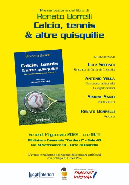 Serata frizzante in Biblioteca a Città di Castello, alla presentazione del libro di Renato Borrelli “Calcio, tennis & altre quisquilie” : tanta gente alla Sala 42, il massimo della capienza consentita in questo periodo, ed 1 ora e mezzo di aneddoti, storie, ironia… Tutto con leggerezza, e la piena partecipazione del pubblico che ha piacevolmente interagito con l’autore. Simone Santi ha offerto al medesimo più di uno spunto per ‘scavare’ all’interno delle storie raccontate nel volume, definito un lavoro ‘agile, e di facile e coinvolgente lettura’ : come è in effetti. L’editore Antonio Vella di Luoghinteriori ha sottolineato la valenza di inaugurare la propria produzione 2022 con un autore tifernate, oltretutto ‘uno di famiglia, nella sua veste di conduttore della serata di gala del Premio Letterario Città di Castello, ogni anno a fine ottobre’. Al sindaco Luca Secondi è spettato far gli onori di casa (la splendida struttura di via XI settembre é di proprietà Comunale), non senza aver evidenziato il proprio estremo piacere ‘nel venir coinvolto in un evento non secondario, perché parlare di sport, e soprattutto incoraggiare a praticarlo come si fa in queste pagine da leggere tutte in un fiato, è opera meritoria che raccoglie tutto il favore mio e dell’ amministrazione che rappresento’. Borrelli è apparso colpito da tanta entusiastica partecipazione, e ha dichiarato convinto che “se anche pochi, una volta letto il libro, si sentissero motivati ad alzarsi dal divano e darsi ad una qualsivoglia, anche leggera, attività sportiva: bene, potrà dire con orgoglio di aver raggiunto il proprio scopo! ‘.”Calcio, tennis & altre quisquilie”, andato letteralmente a ruba per le decine di copie disponibili alla presentazione (con l’ autore che si è prestato ben volentieri ad una lunga sessione di ‘firmacopia’ con dediche personalizzate), lo si può trovare presso la libreria Paci e l’edicola Alunni in via Carlo Liviero, oltre che nei vari store online (Amazon e c.),e direttamente sul sito www.luoghinteriori.it