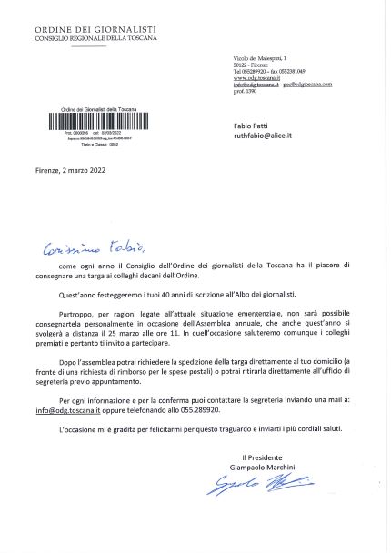 Sono passati 40 anni dalla mia prima iscrizione all’Ordine dei Giornalisti e il Presidente Regionale Marchini mi ha inviato questa Sua che ho apprezzato tantissimo.