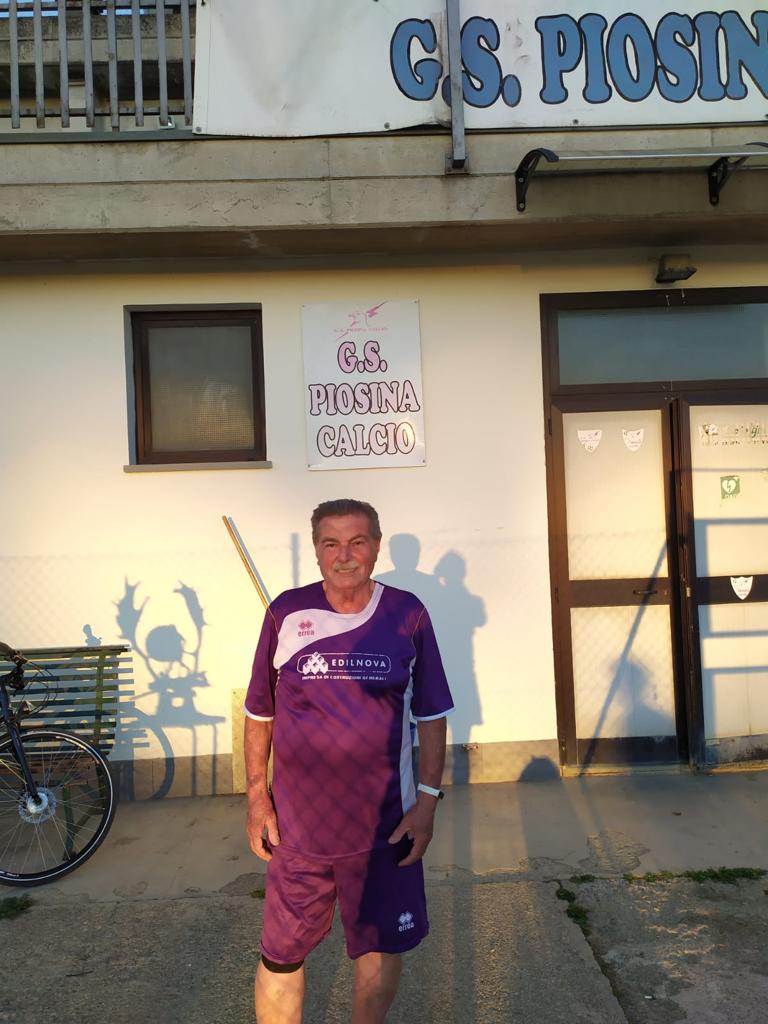 A 82 anni “suonati” scende in campo con una formazione amatoriale e dopo il calcio d’inizio disputa alcuni minuti di gioco di una sfida fra “scapoli” e “ammogliati” allo stadio comunale di Piosina nella settimana clou della rievocazione storica della “Battitura” in corso di svolgimento fino a domenica 17 luglio.