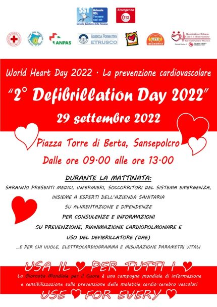 In Piazza Torre di Berta a Sansepolcro, giovedì 29 settembre dalle 9 alle 13, in occasione del World Heart Day 2022 (giornata mondiale di prevenzione cardiovascolare) l’Asl Toscana sud est ha organizzato la seconda edizione del Giorno delle defibrillazioni che ha come obiettivo cardine la diffusione della cultura dell’uso precoce del defibrillatore semiautomatico nella popolazione per il primo soccorso all’arresto cardiaco sul territorio. Per chi vuole possibilità di effettuare elettrocardiogramma, misurazione parametri vitali, misurazione BMI, misuratore della CO, etilometro, carbossimetro.