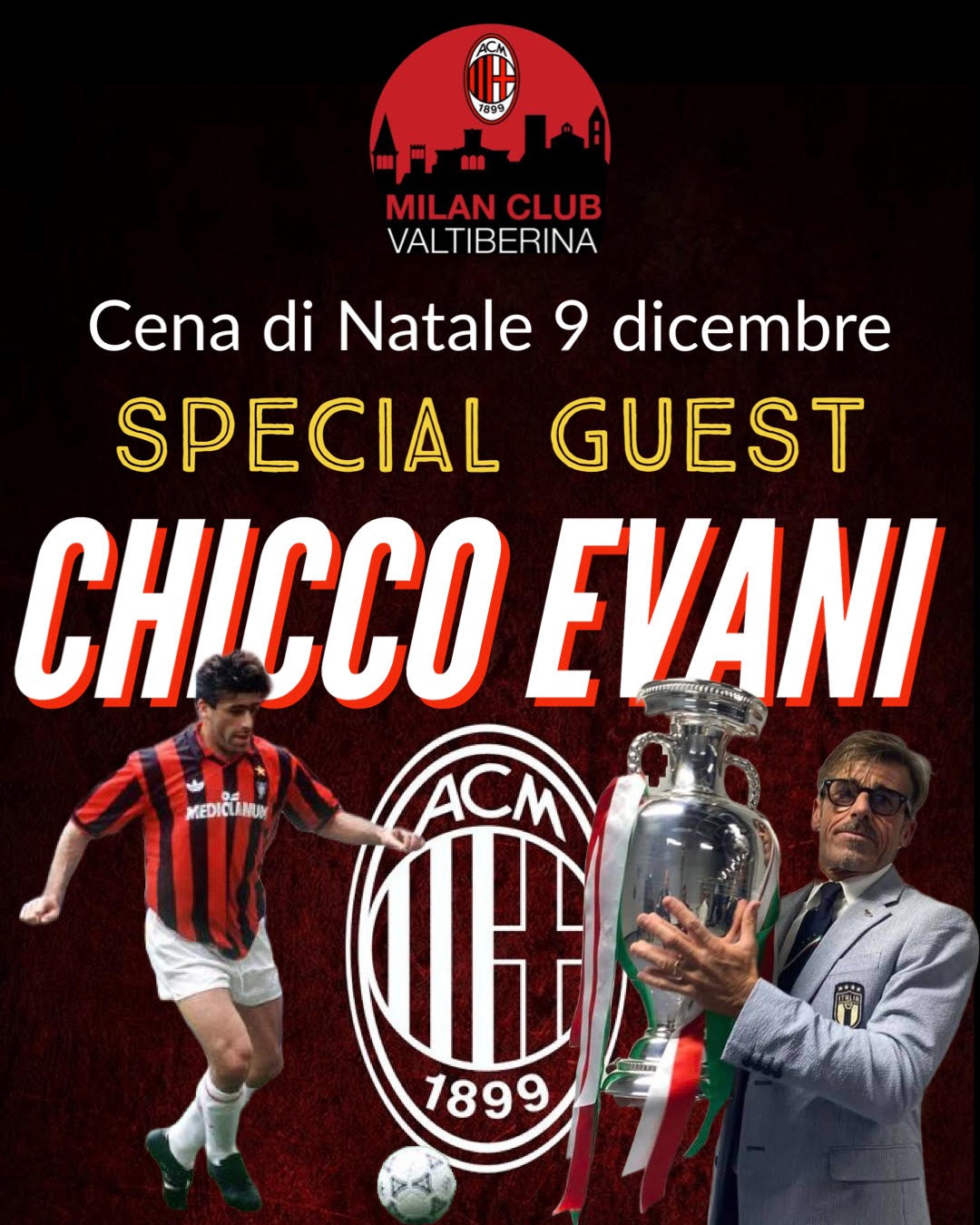 In occasione dell’evento di Natale sarà ospite del Milan Club Valtiberina Alberigo “Chicco” Evani, allenatore in seconda della Nazionale Italiana campione d’Europa in carica e vincitore, con la maglia rossonera, di 12 trofei nazionali ed internazionali.