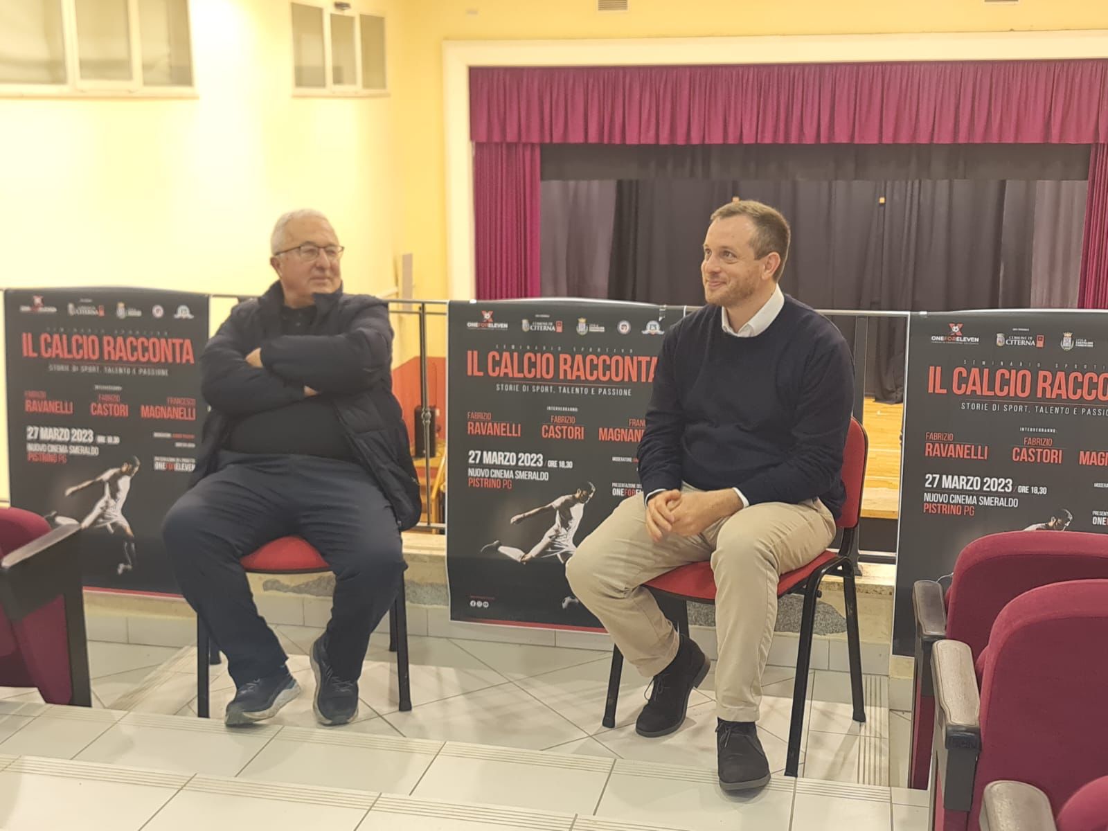 C’era il sindaco di Citerna, Enea Paladino, entusiasta dell’iniziativa, c’erano i rappresentanti della Pro Loco di Pistrino, il Presidente degli arbitri della sezione di Città di Castello, Gabriele Magrini, tecnici della locale squadra, ex giocatori ora impegnati come allenatori o direttori sportivi: Francesco Cangi della Pianese, Andrea Bricca del Gubbio con Fabio Catacchini, anche lui a Gubbio, giocatori attuali come Matteo Giorni della Baldaccio Bruni Anghiari, Nicola Petricci del Lama allenatori dei settori giovanili, come Diego Fabbri del Città di Castello, l’ex dirigente Massimo Bevignani, ma soprattutto c’era lui, l’ideatore dell’iniziativa, Maurizio Falcinelli, oltre alle Tv, radio e carta stampata presenti a Pistrino al Cinema Smeraldo.