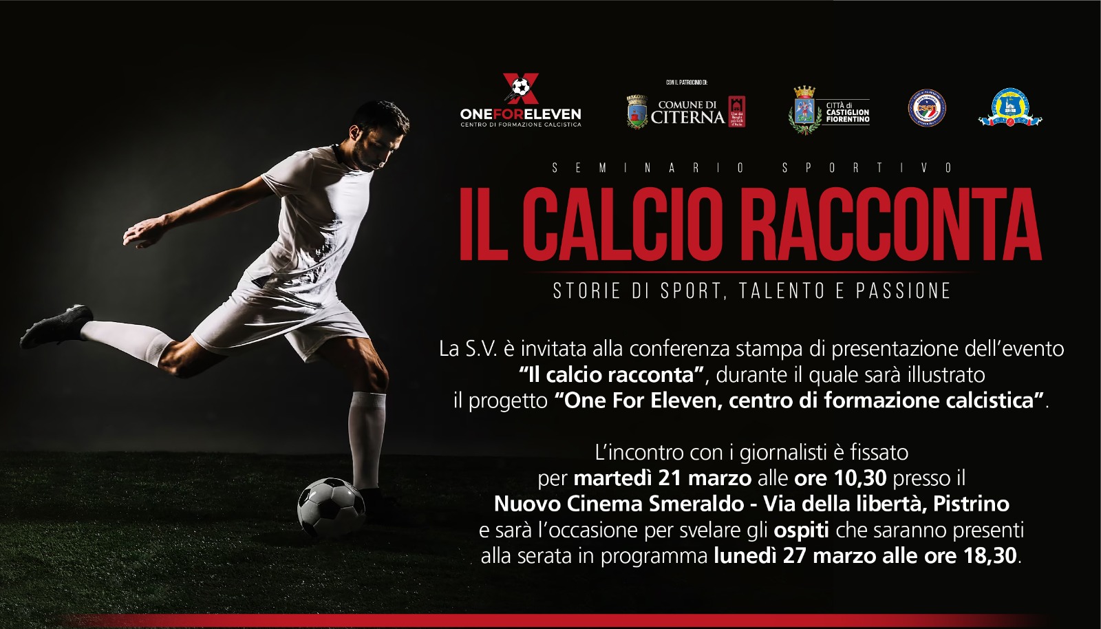 L’evento, patrocinato dai Comuni di Citerna e Castiglion Fiorentino, dal CSEN (Centro Sportivo Educativo Nazionale) e dalla Pro Loco di Pistrino, sarà l’occasione per rivivere le storie di tre carriere partite dai campetti di paese ed arrivate poi fino ai palcoscenici più importanti del calcio nazionale ed internazionale. Durante la serata, dal titolo “Il calcio racconta: storie di sport, talento e passione”, sarà presentato dagli organizzatori il progetto “One For Eleven, centro di formazione calcistica”. Ovvero: “In un mondo, quello sportivo e calcistico in particolare, in cui le contrapposizioni si fanno sempre più marcate, in cui all’incontro si preferisce lo scontro, One for Eleven nasce per fare qualcosa “con” e mai “contro”.