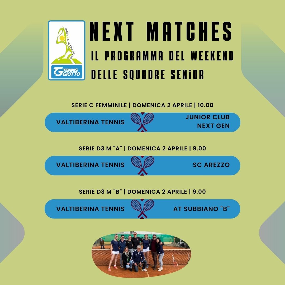Le partite casalinghe al PalaPiccini per il Valtiberina Tennis di Sansepolcro, dopo la gara inaugurale in trasferta con il Firenze Ovest vinta 3-1 per la serie C femminile, saranno domenica 2 aprile, alle 10, con lo Junior Club Next Gen di Marina di Carrara e domenica 16 aprile contro il Tennis Park di Calenzano. Il quarto e ultimo turno di serie C femminile sarà domenica 7 maggio contro la Coop Tennis Livorno, potendo così arrivare a definire la classifica definitiva con le prime due squadre che avranno accesso ai Play Off per la serie B2 e le ultime due scenderanno in D1.