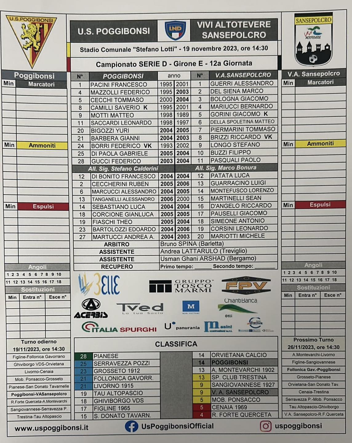 19 novembre 2023 by Patti Fabio Pari del Sansepolcro a Poggibonsi Calcio Lascia un commento Il Sansepolcro senza Borgo, Civilleri, Essoussi e Ferri Marini, pareggia 0-0 a Poggibonsi. Queste le formazioni iniziali: Condividi: Fai clic per condividere su X (Si apre in una nuova finestra) X Fai clic per condividere su Facebook (Si apre in una nuova finestra) Facebook Mi piace Caricamento... Correlati