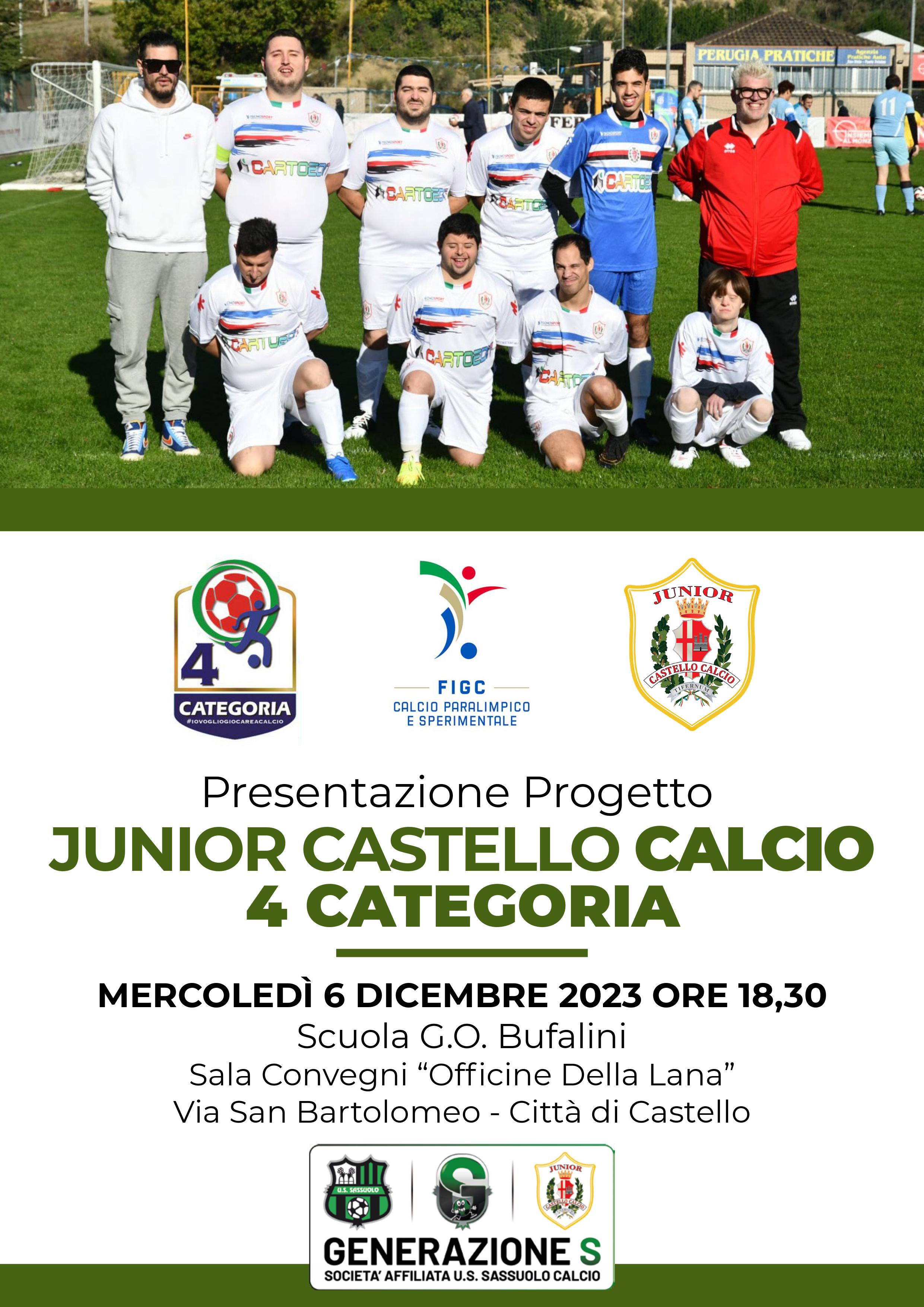 Alle ore 18,30 di mercoledì 6 dicembre conferenza stampa di presentazione del Campionato di Quarta Categoria, stagione 2023-2024, riservato ai ragazzi diversamente abili, cui partecipa anche la società ASD JUNIOR CASTELLO CALCIO nella Sala Convegni Officina della Lana, del Centro di Formazione Professionale Opera Pia G.O. Bufalini in Città di Castello, Via San Bartolomeo n.1 .