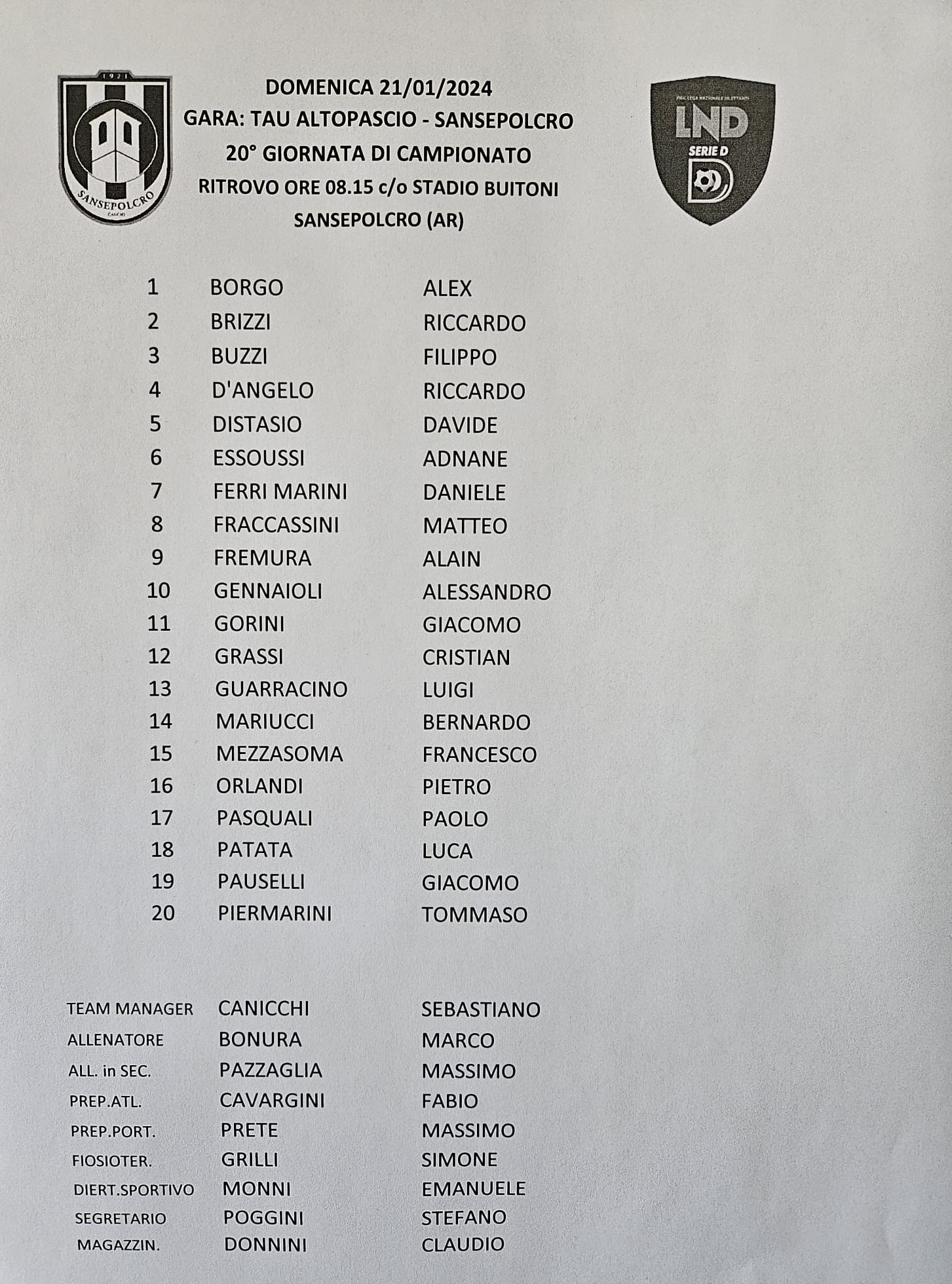 20 gennaio 202420 gennaio 2024 by Patti Fabio I convocati del Sansepolcro Calcio Lascia un commento Ecco i convocati per la trasferta di Altopascio da parte di Bonura Condividi: Condividi su X (Si apre in una nuova finestra) X Condividi su Facebook (Si apre in una nuova finestra) Facebook Mi piace Caricamento... Correlati