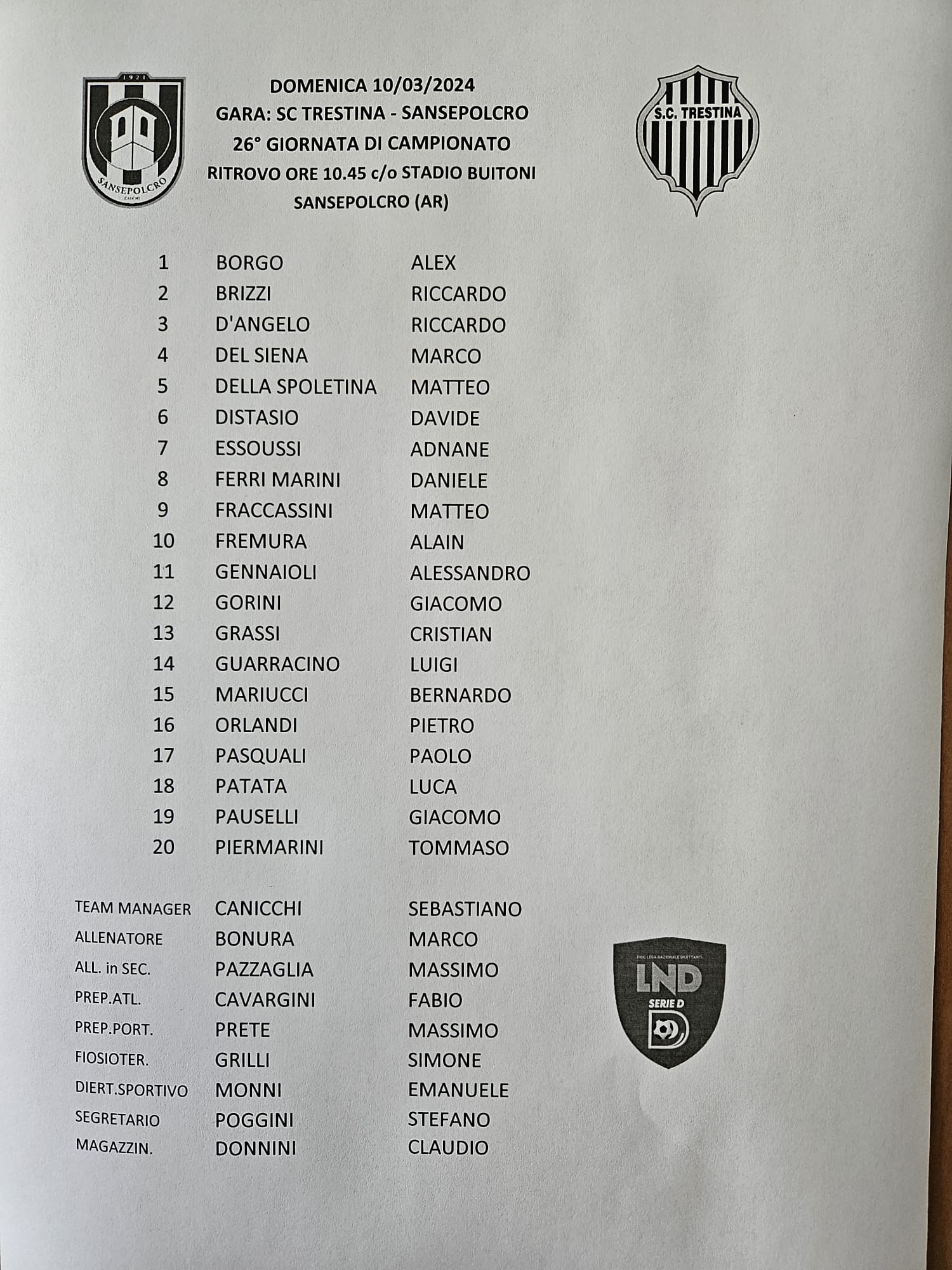 9 marzo 2024 by Patti Fabio Al Casini Calcio Lascia un commento Aria di derby tra Trestina e Sansepolcro, sfida numero 14 ed ecco i convocati bianconeri (entrambe le squadre hanno gli stessi colori sociali) del Sansepolcro: Condividi: Condividi su X (Si apre in una nuova finestra) X Condividi su Facebook (Si apre in una nuova finestra) Facebook Mi piace Caricamento... Correlati