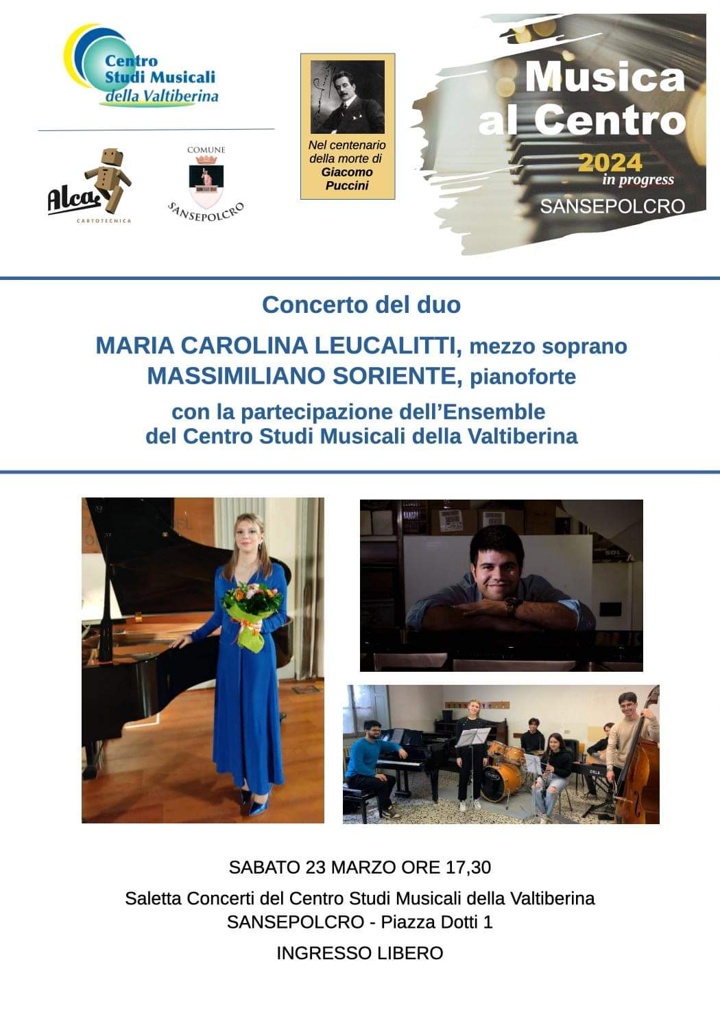 Oggi alle ore 17,30 a Sansepolcro nella Saletta Concerti del Centro Studi Musicali della Valtiberina in piazza Dotti 1, 1° piano dell’ex Scuola Media Luca Pacioli, si terrà un nuovo concerto per il ciclo “Musica al Centro – in progress”. Protagonisti ancora due giovanissimi interpreti, il mezzo-soprano aretino Maria Carolina Leucalitti e il pianista biturgense Massimiliano Soriente, che proporranno un raffinato programma diviso tra repertorio cameristico e lirico per concludere poi con una piccola escursione nell’ambito dell’operetta. Per questo brano il duo sarà affiancato dall’Ensemble del Centro Studi Musicali della Valtiberina, il gruppo di musica d’insieme curato dal M° Angelo Benedetti. Anche in questo concerto non mancherà un omaggio a Giacomo Puccini con l’esecuzione di due deliziose pagine cameristiche, una ninna-nanna e una romanza.