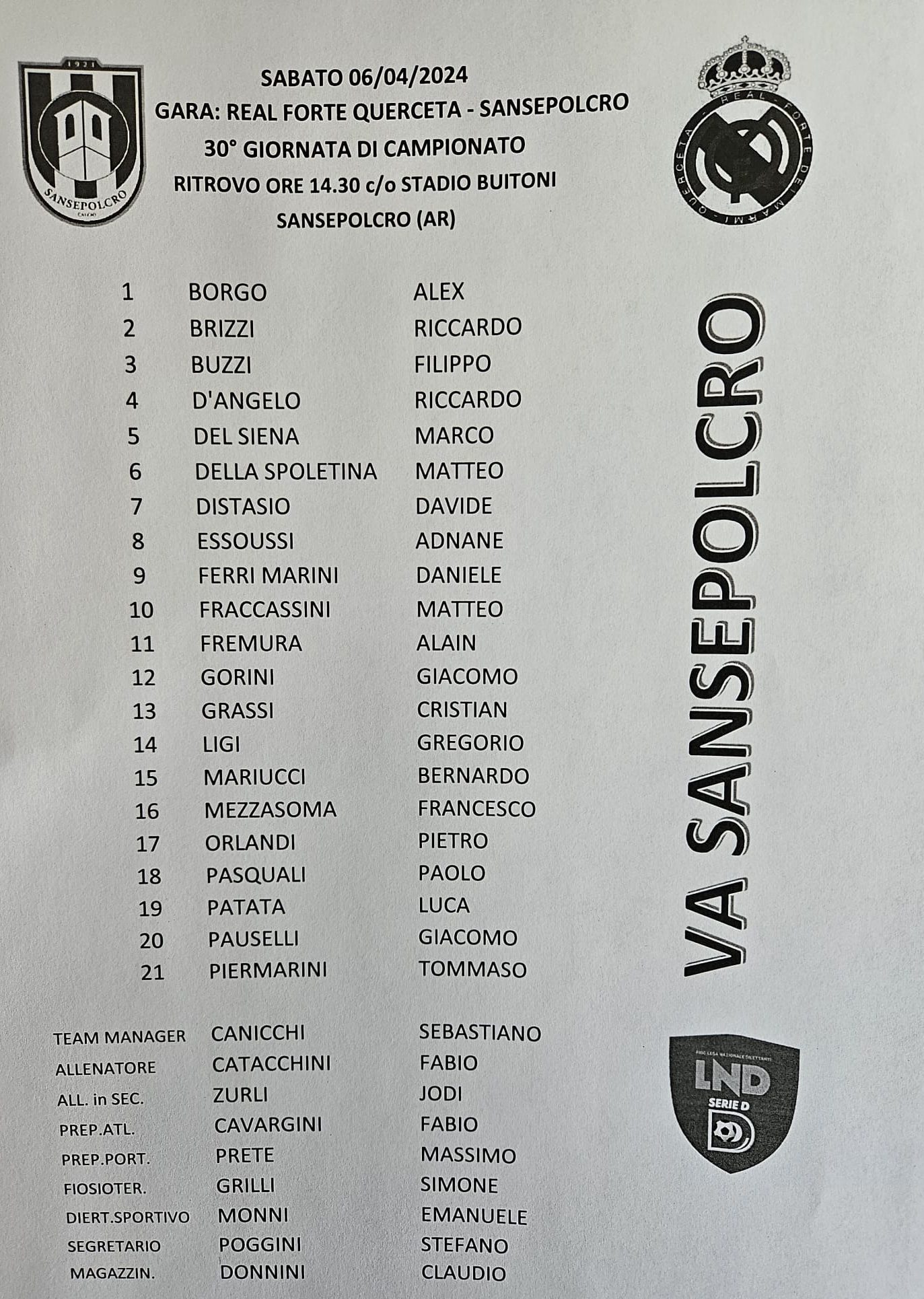 La partita, per il Sansepolcro da “o la va o la spacca” la squadra bianconera deve vincere a Forte di Marmi contro la Real Forte Querceta per continuare la marcia verso la salvezza. Fabio Catacchini (nella foto) ha convocato tutti i disponibili , 21, eccetto Gennaioli e per uno dei 21 sarà tribuna.
