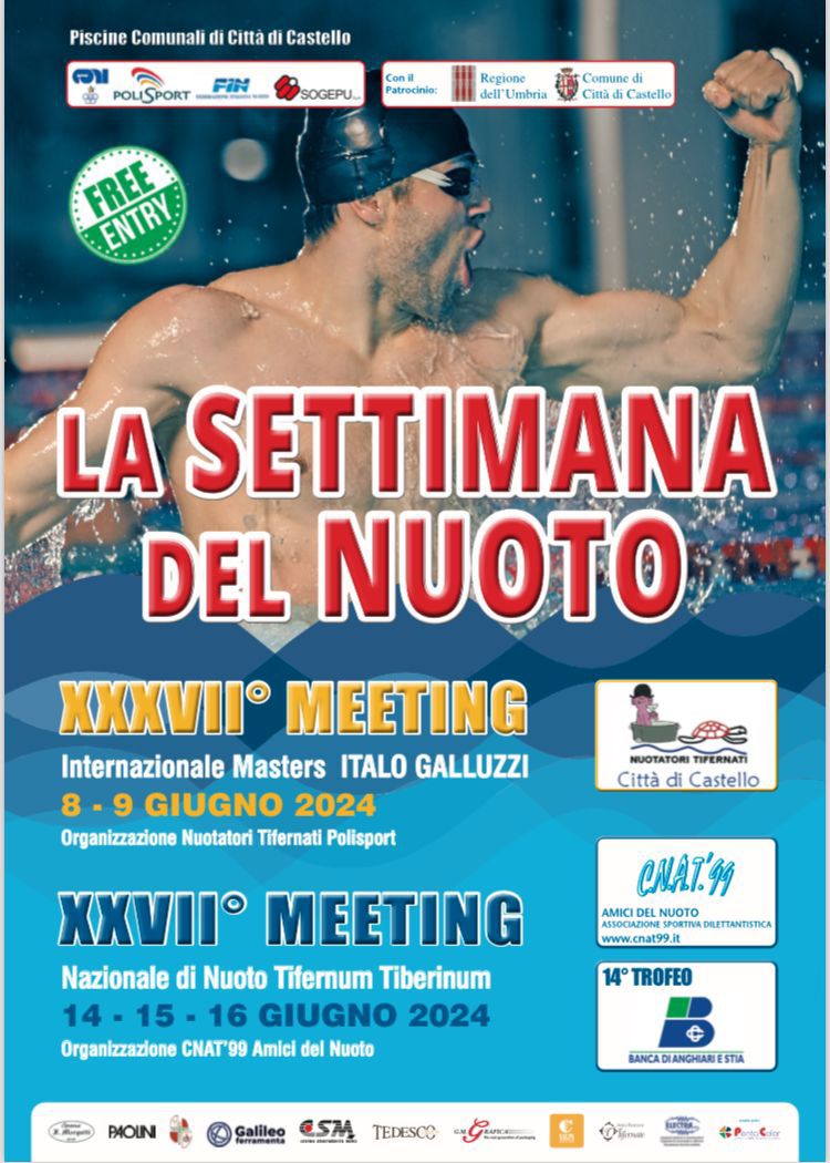 Presentata la “Settimana del nuoto” di Città di Castello: per due week-end con il XXXVII Meeting Internazionale Masters Italo Galluzzi e il XXVII Meeting Nazionale di Nuoto Tifernum Tiberinum numeri da record con circa 3.000 atleti e accompagnatori nella piscina comunale tifernate. Previsti tre tentativi di primato master e l’omaggio alle figure di Francesco Damiani, Antonio Giambi e Giuseppe Migliorati.