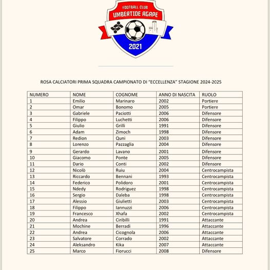 Ecco la rosa dei calciatori della prima squadra dell’Agape Umbertide che da mercoledì 24 Luglio, si sono ritrovati al campo sportivo “Maurizio Ferrari” di Umbertide per l’inizio della preparazione al campionato di Eccellenza Umbra.