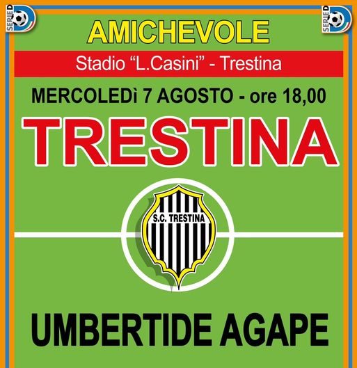 Nuovo test, mercoledì 7 agosto per il Trestina. La squadra di mister Calori affronterà alle 18,00 allo Stadio Casini di Trestina, l’Umbertide Agape che, per la prima volta, disputa il Campionato di Eccellenza Umbra. Il Trestina viene dalla sconfitta in casa contro la Primavera del Cesena per 2-1 e dal pari, interno, ma al Bernicchi di Città di Castello contro il Montevarchi. L’Umbertide Agape viene dal successo, in trasferta, nell’allenamento congiunto con la Baldaccio Bruni Anghiari per 3-2.