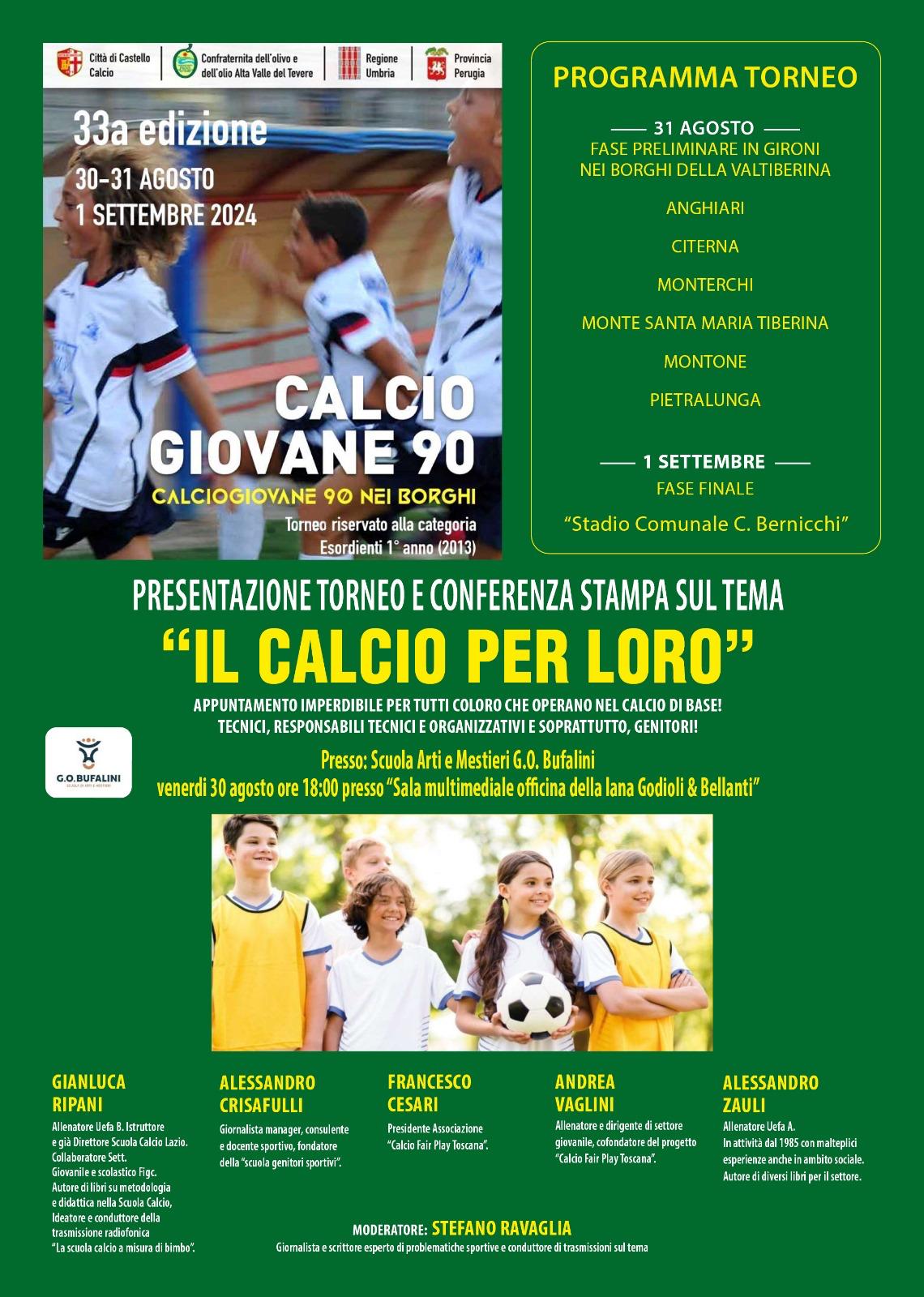 Venerdì 30 agosto a Città di Castello ore 18, Sala Multimediale Officina della Lana, via San Bartolomeo – il primo imperdibile appuntamento del Torneo Calciogiovane90 per il convegno di apertura, durante il quale interverranno illustri personalità del mondo calcistico, che offriranno il proprio contributo per la delineazione di un nuovo concetto di sport giovanile, connotato da valori educativi e formativi all’insegna dell’inclusione, della creatività e della libera espressione del talento di ciascun giovane giocatore. Sono previsti i seguenti contributi: