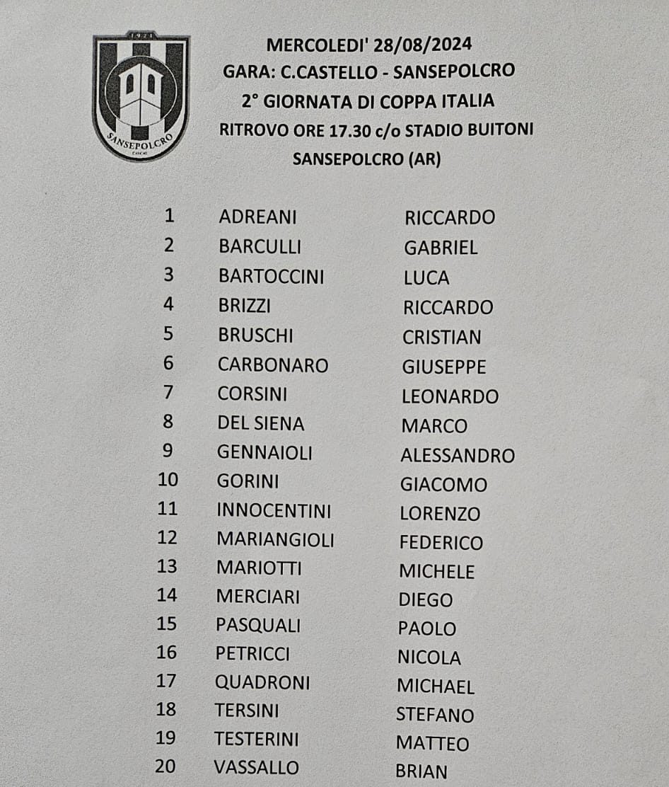 Torna dopo tanti anni il derby di vallata tra Città di Castello e Sansepolcro, Tra i bianconeri non ci sarà Riccardo Valori che non è stato convocato dal tecnico Antonio Armillei. Per l’allenatore del Sansepolcro ed il suo staff sarà un ritorno a Città di Castello avendo allenato la squadra biancorossa, oggi nelle mani di Palazzi, nella passata stagione. Questi i convocati del Sansepolcro, per l’inizio che sarà dato allo Stadio Bernicchi alle 20,45: