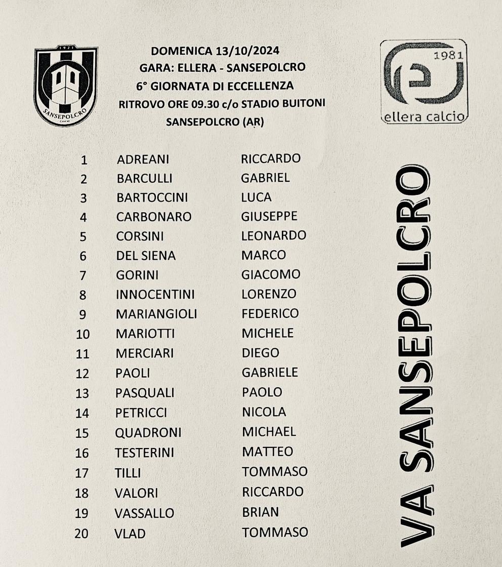 Non ci saranno per il Sansepolcro, nella delicata trasferta di Ellera, gli squalificati Gennaioli e Brizzi, oltre all’infortunato Bruschi. Bianconeri di Armillei votati ad una partita attenta contro una squadra che due anni fa ha lottato sino alla fine per l’approdo in serie D e che quest’anno, in modo sornione, sta ottenendo punti importanti, vedi la vittoria a Pietralunga e domenica scorsa a Terni. Il Sansepolcro potrebbe schierare: Vassallo, Del Siena, Merciari, Gorini, Adreani, Tersini, Pasquali,Testerini, Bartoccini, Valori, Quadroni. Ecco i convocati: