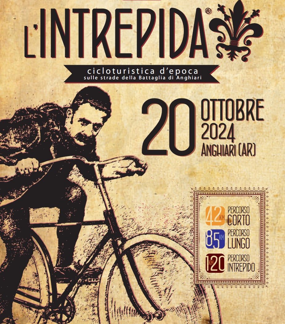 Tutto pronto ad Anghiari per l’edizione 2024 de L’Intrepida. La cicloturistica non competitiva su bici d’epoca si svolgerà domenica 20 ottobre con partenza alle ore 8,45 da Piazza Baldaccio, la partenza degli intrepidi che poi animeranno i tre percorsi, pedalando sulle strade bianche della Battaglia di Anghiari, ammirando paesaggi meravigliosi, gustando le prelibatezze dei ristori d’epoca (in tutto otto), condividendo assieme a tanti amici la passione per il ciclismo storico avverrà alle 8,45.Il numero degli iscritti si avvicina a 800, un dato di grande spessore, ma non definitivo. Domenica per chi non pedala c’è la possibilità di partecipare alla “Camminata con L’Intrepida” organizzata dalla sezione CAI di Sansepolcro, mentre alle ore 15,30 in Piazza IV Novembre si terrà la seconda edizione di “Barbology” (storie di barba), Concorso Hipster & Moustache.