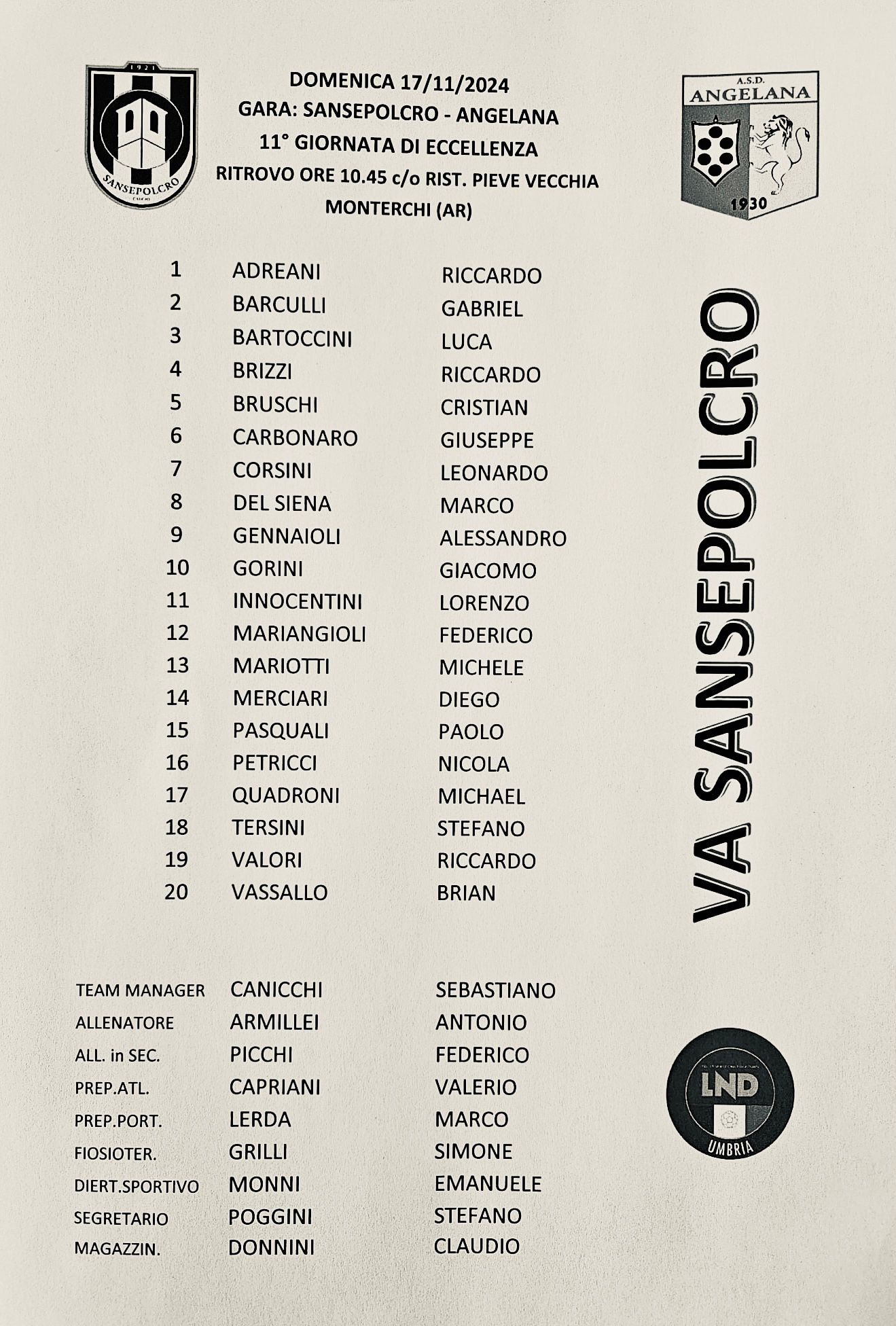 Con il ritorno di Valeriano Recchi allo Stadio Buitoni di Sansepolcro, Armillei recupera Bruschi, squalificato nella precente partita e deve approfittare della delicata trasferta del Pierantonio a Terni. Ovvio che i tre punti diventano importanti per il Sansepolcro, ma non sarà facile contro un’Angelana nata per dar fastidio a tutti. Nell’Angelana mancheranno gli squalificati Sallaku e Melillo, espulsi domenica, che hanno avuto un turno di stop. L’Angelana non si avvarrà inoltre più della collaborazione dell’argentino Russo, ma in compenso ha acquistato l’attaccante Ndiaye Bebeto ex Pietralunghese.