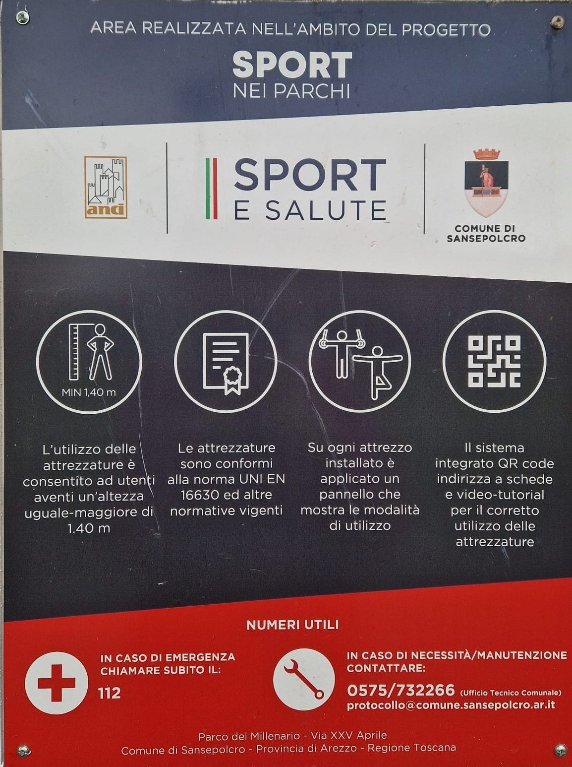 Dopo tanti parchi aperti su tutto il territorio nazionale, è ora il Comune di Sansepolcro, da sempre attento al benessere e alla salute della propria cittadinanza, che aderisce alla promozione del wellness nei giardini, nei parchi e nelle aree urbane. L’Area Attrezzata digitalizzata – in rete con tutte le altre già installate nel resto del Paese – si trova nell’area del parco del Millenario e sarà un luogo dedicato al benessere di tutti i cittadini. Per stare insieme, per praticare attività fisica, esercitandosi da soli o in gruppo. Su ogni singolo attrezzo, ciascuno potrà scaricare i tutorial di allenamento, attraverso un semplice QR Code, potendo così fare attività fisica nel verde, per rigenerare corpo e mente.