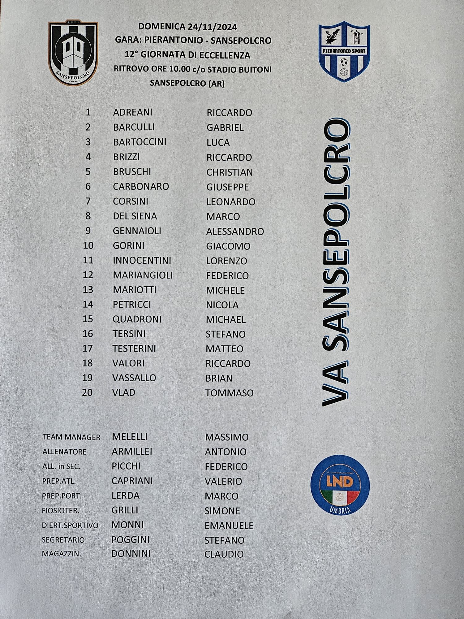 Valtiberina e Altotevere a confronto: Sansepolcro primo in classifica in Eccellenza Umbra, Pierantonio terzo. I bianconeri vengono dal successo di domenica scorsa a spese dell’Angelana, ma saranno privi di Merciari e Pasquali infortunati, mentre nel Pierantonio saranno assenti per squalifica Rondoni e Salis J. Per cui la probabile formazione del Sansepolcro potrebbe essere: Vassallo, Adreani, Del Siena, Gorini, Innocentini (2006), Tersini, Gennaioli (2005), Bruschi, Bartoccini, Valori, Barculli (2006). In panchina (ma questa è solo una nostra idea): Mariangioli, Brizzi, Carbonaro, Corsini, Mariotti, Petricci, Quadroni, Testerini, Vlad. IL Pierantonio potrebbe schierare: Zandrini, Pettinelli, Allegrucci, Gaggioli, Petrara (2006), Scarlino (2004), Berrettini (2006), Procacci, Fastellini, De Julis, Passeri Nel Pierantonio due ex Sansepolcro Montefusco e Passeri