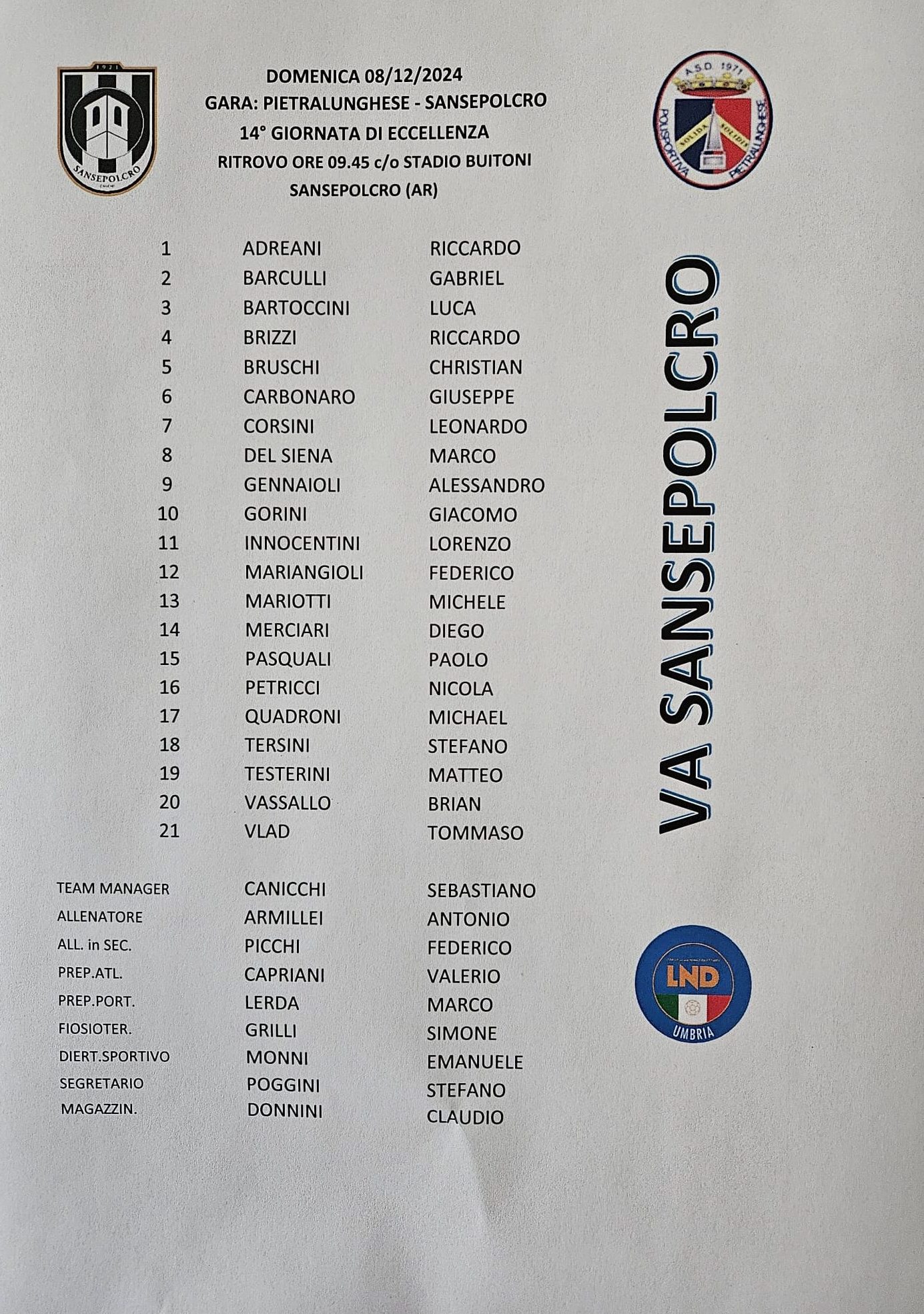 Valori non è stato convocato nel Sansepolcro per una contusione, alla Pietralunghese mancherà Locchi squalificato, in dubbio per il derby inedito delle vallate ci sono Tersini e il febbricitante Adreani nella capolista Sansepolcro. La Pietralunghese insegue a quattro lunghezze e una vittoria sarebbe per la compagine di Pierotti un toccasana dopo lo stop di Cannara (altra capolista), nel frattempo è arrivato il centrocampista, classe 2005, Pauselli con un trascorso a Sansepolcro e quest’anno alla Baldaccio Bruni Anghiari. Il Sansepolcro di Armillei vuole riscattare l’opaca prova di sette giorni orsono con il pari interno per 2-2 con l’Olympia Thyrus dopo il vantaggio di due reti. Il tempo non promette note positive con la neve incombente un po’ in tutta l’Umbria. Arbitrerà Emanuele Rotondo di Frattamaggiore.