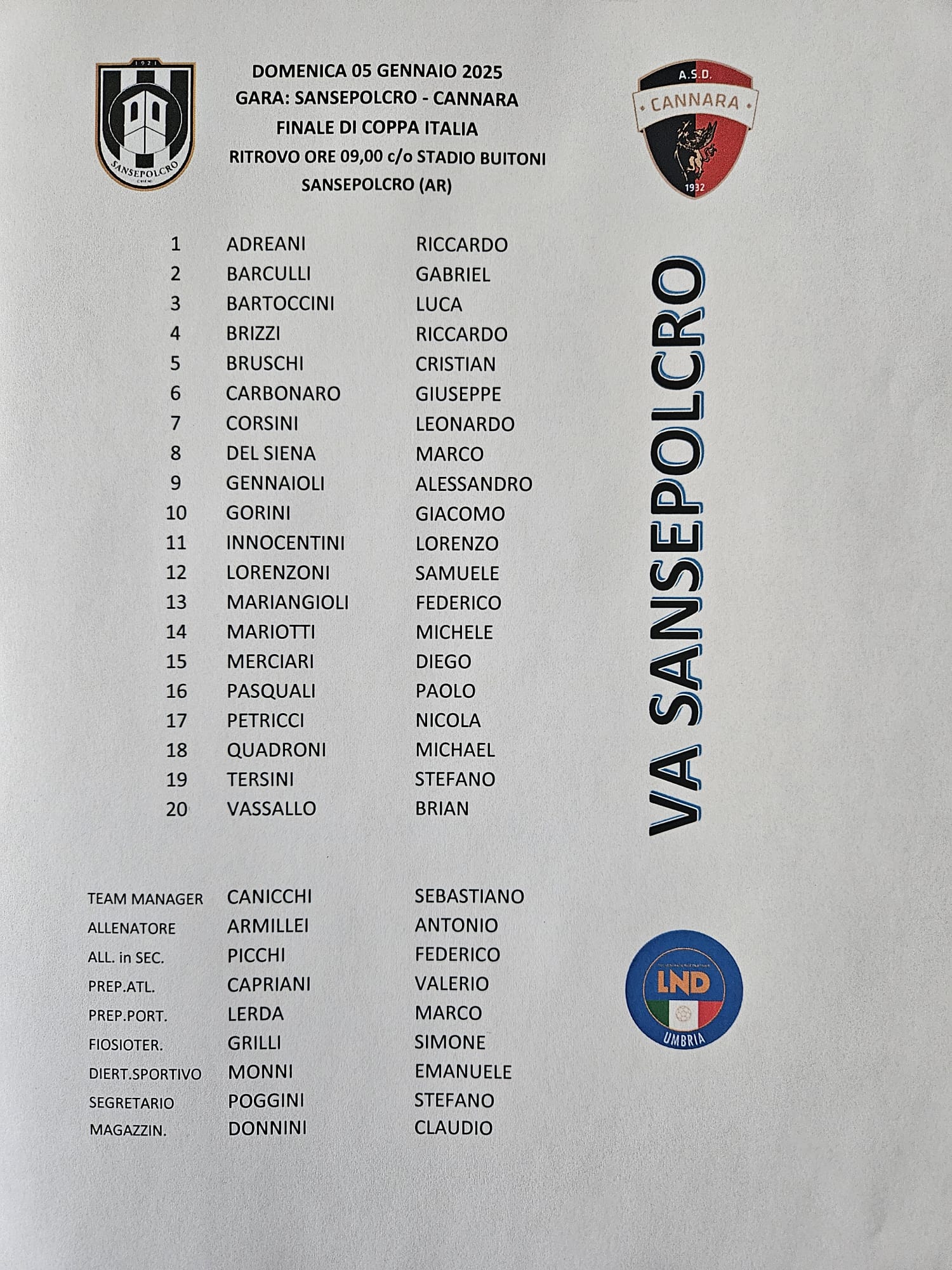 Mancherà Riccardo Valori (nella foto) per squalifica, per il resto il resto il tecnico Armillei avrà tutti a disposizione per la finalissima di Coppa Italia che si disputerà alle 13,30 tra Sansepolcro e Cannara a Bastia. Il Sansepolcro potrebbe schierare: Mariangioli (2004), Carbonaro, Merciari (2006), Gorini, Adreani, Tersini, Gennaioli (2005), Bruschi, Bartoccini, Petricci, Quadroni. In panchina potrebbero andare: Vassallo, Pasquali (2004), Del Siena, Brizzi, Mariotti, Lorenzoni, Corsini (2006), Barculli (2006), Innocentini (2006).