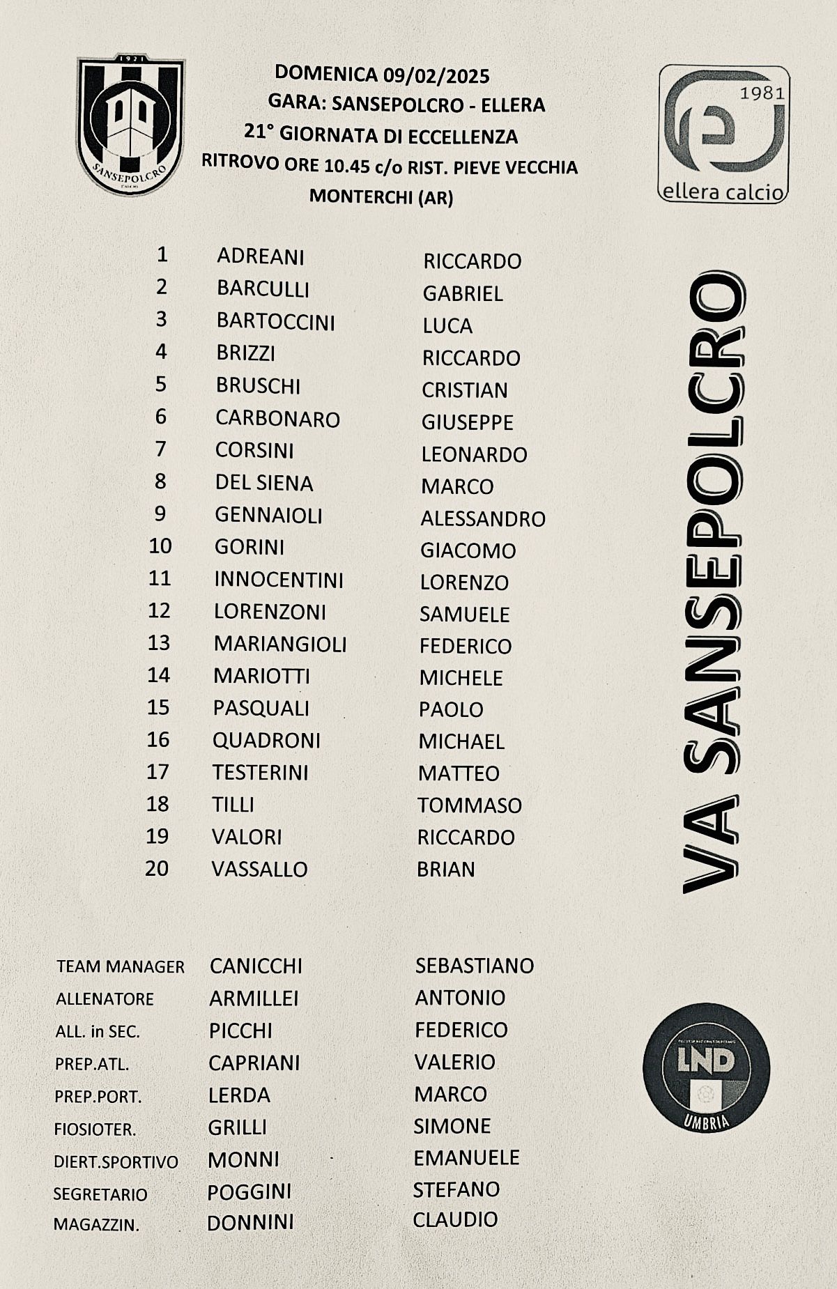 Nell’Ellera mancherà, sempre per squalifica, il centrocampista Riccardo Piccioli. Tra i non convocati del Sansepolcro c’è anche l’ultimo arrivo, il portiere Matteo Vaccarecci, visto che Mariangioli si recherà in Polonia dopo metà febbraio per gli studi Erasmus.
