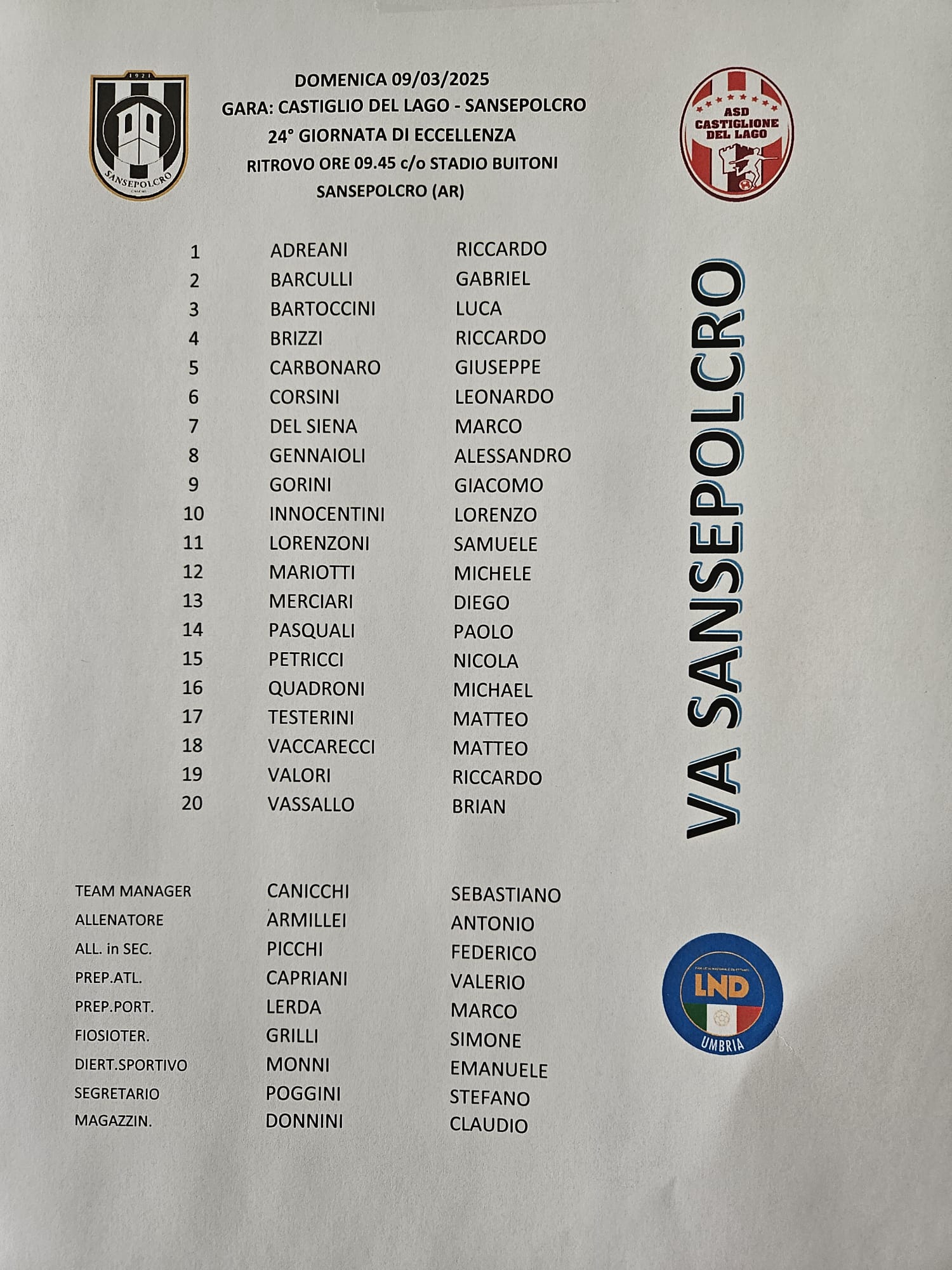 Ottenuto il pareggio per 0-0 a Sesto Fiorentino, nei quarti di finale andata di Coppa, il Sansepolcro si rituffa sul campionato andando senza Bruschi ad affrontare l’unica squadra che è passata al Buitoni, vincendo 2-1, dopo che Riccardo Adreani aveva aperto le danze per i bianconeri. Poi il pari e quindi il goal di Vassallo a dare la vittoria esterna ai lacustri. La squadra allenata da Volpi dovrebbe partecipare ai playout anche se la lotta è sempre incerta nelle zone a rischio. Armillei ha convocato, dovendo fare a meno dello squalificato Bruschi e senza Tersini con quest’ultimo che ha disputato a Terni, il 19 gennaio, l’ultima partita dopo l’infortunio alla schiena, ha convocato 20 giocatori, tra di loro c’è anche Merciari (2006) che a causa dell’infortunio alla caviglia non vediamo giocare dal 2 febbraio, da più di un mese ma che dovrebbe essere schierato.