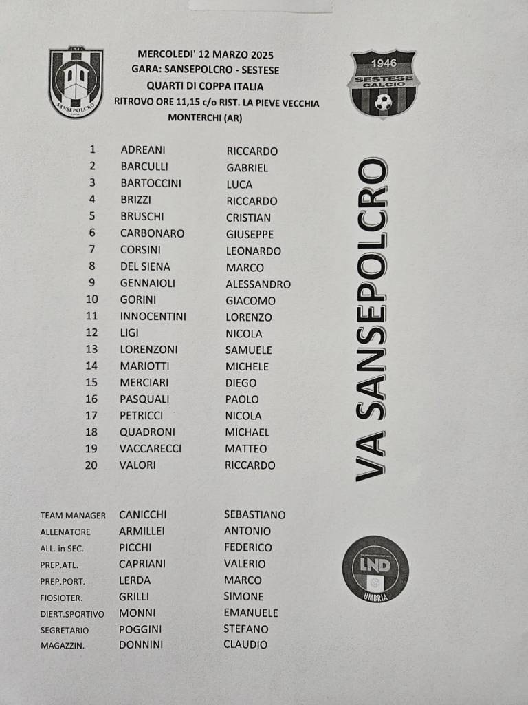 Senza Tersini e Vassallo il Sansepolcro si accinge ad affrontare la Sestese. La squadra di Armillei alle prese con campionato e Coppa, spera di battere i fiorentini e accedere così alle semifinali. Sestese, seconda nel girone A di Eccellenza Toscana, punta, avendo il Camaiore vinto il campionato, ad andare avanti. Non scordiamoci, infatti, che chi vincerà la Coppa Italia, sarà in serie D. Sarà, quindi, una partita tutta da vedere. Poi per il Sansepolcro la gara di Campionato, domenica 16 marzo, quando arriverà il Tavernelle. Il Presidente Brizzi e tutto lo staff vogliono accedere alle semifinali nazionali dove troveranno o il Codroipo in provincia di Udine o la provincia di Brescia dove li ospiterà con il Rovato Vertovese. Al Buitoni si giocherà alle 15, un passo alla volta quindi ed ora occhi puntati sulla Sestese che si gioca tutto dopo lo 0-0 dell’andata. Nel sansepolcro mancheranno Vassallo e Tersini, per cui non essendoci la regola del fuori quota, Armillei potrebbe impiegare: Vaccarecci, Del Siena, Carbonaro, Gorini, Lorenzoni, Adreani, Bruschi, Brizzi, Bartoccini, Valori, Mariotti. In panchina ci potrebbero essere Ligi, Merciari, Innocentini, Petricci, Quadroni, Barculli, Corsini, Gennaioli, Pasquali.