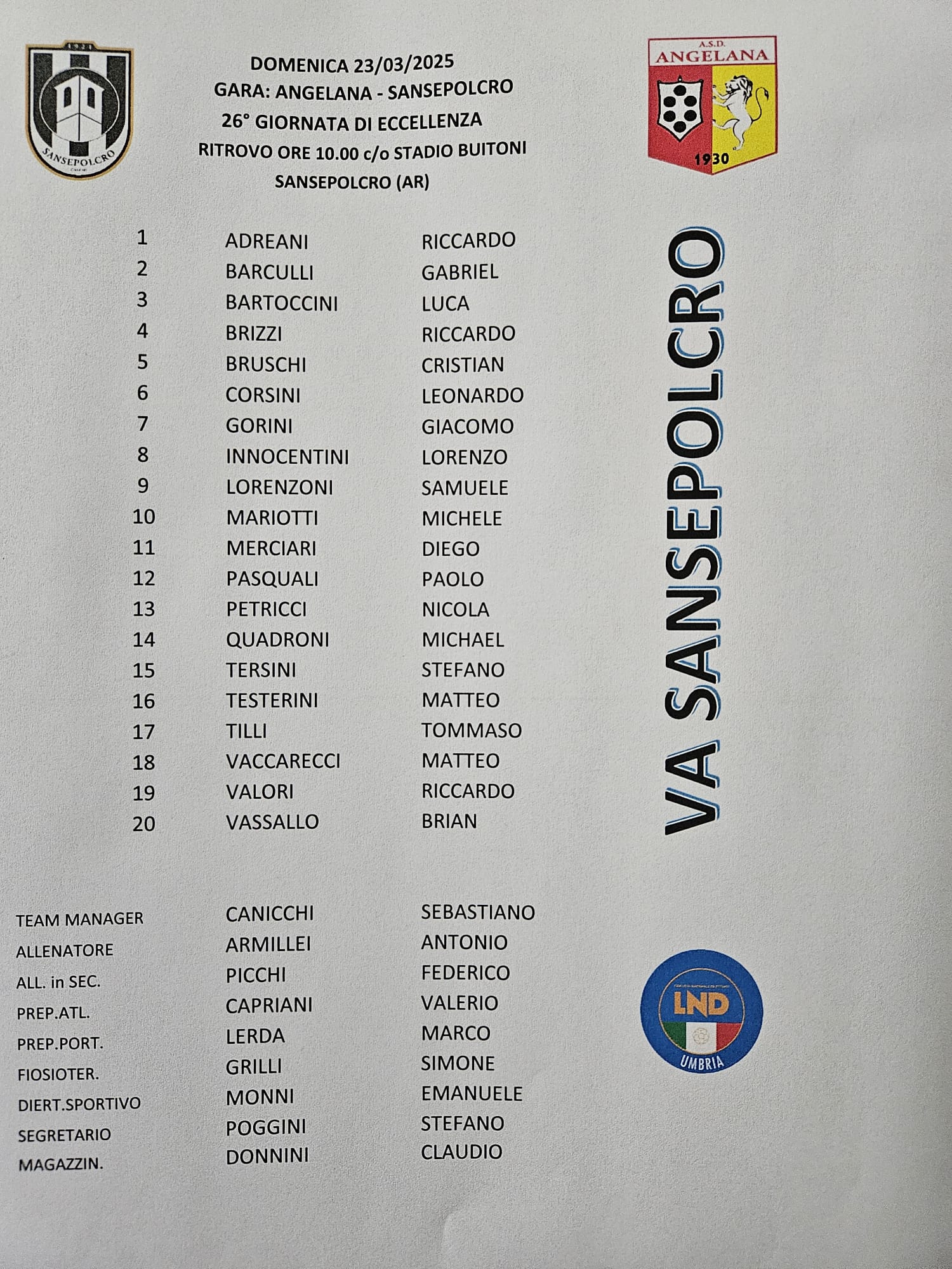 La probabile formazione potrebbe vedere: Vaccarecci, Lorenzoni, Merciari (2006), Gorini, Tersini, Adreani, Corsini (2006), Bruschi, Bartoccini, Pasquali (2004), Mariotti, In panchina ci potrebbero andare: Vassallo, Barculli, Petricci, Valori, Testerini, Tilli, Innocentini, Quadroni, Brizzi. Sansepolcro primo con 50 punti, Angelana seconda con 48. Angelana al gran completo, Sansepolcro con tre assenti ma con la miglior difesa, l’Angelana ha invece il cannoniere del Campionato: Bebeto, ma dall’altra parte, quella giallo-rossa, questa volta come tecnico, c’è Valeriano Recchi, indimenticato difensore dell’era Trillini.