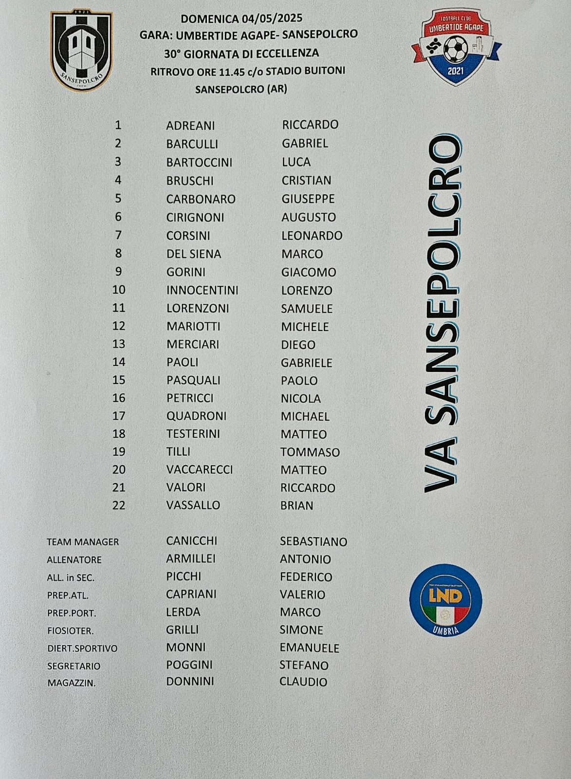 Privo degli squalificati Brizzi e Tersini, oltre che dell’infortunato Gennaioli, il Sansepolcro si reca ad Umbertide contro un’Agape dove mancherà lo squalificato Montani. Armillei, tecnico del Sansepolcro ha convocato questi giocatori: