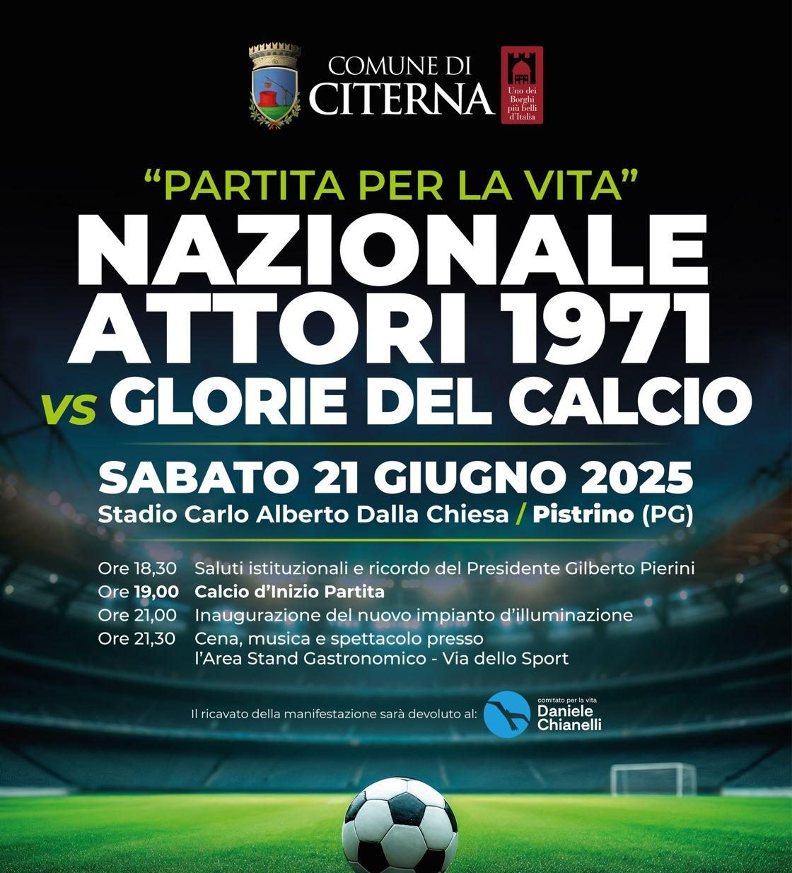Eccoci arrivati all’atteso appuntamento che sabato 21 giugno dalle ore 18,30 calamiterà l’attenzione della Valtiberina Toscana e dell’Altotevere Umbro con i biglietti che a Pistrino di Citerna sono andati a ruba. Di fronte la Nazionale attori 71, guidata da Giancarlo Oddi e le glorie del calcio affidate a Maurizio Falcinelli e Fabio Catacchini. Lo stadio Carlo Alberto Dalla Chiesa di Pistrino, ospiterà “La Partita per la Vita”. A sfidarsi in occasione dell’inaugurazione del nuovo impianto di illuminazione dello stadio saranno la Nazionale Attori 1971 e le Glorie del Calcio. L’appuntamento è fissato per le ore 18:30 e visto il numeroso pubblico atteso per l’occasione, alla tribuna fissa dello stadio ne sono state aggiunte due mobili. Prima del match si terrà la cerimonia commemorativa in ricordo del compianto Presidente della Polisportiva Pistrino, Gilberto Pierini. A seguire cena, musica e spettacolo all’area stand gastronomico in Via dello Sport.