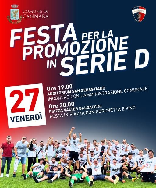 Due promozioni in due campionati ed il Cannara è in serie D. È la quinta squadra che rappresenterà l’Umbria nel quarto campionato italiano. Giocatori e staff si ritroveranno venerdì 27 giugno dalle 19 con i supporters rosso-blù in Piazza Baldaccini per celebrare con mister Ortolani e i suoi ragazzi il passaggio di categoria ottenuto nella doppia finale di Pinerolo. Una festa per i 4.200 abitanti del comune con in testa il sindaco della cittadina.