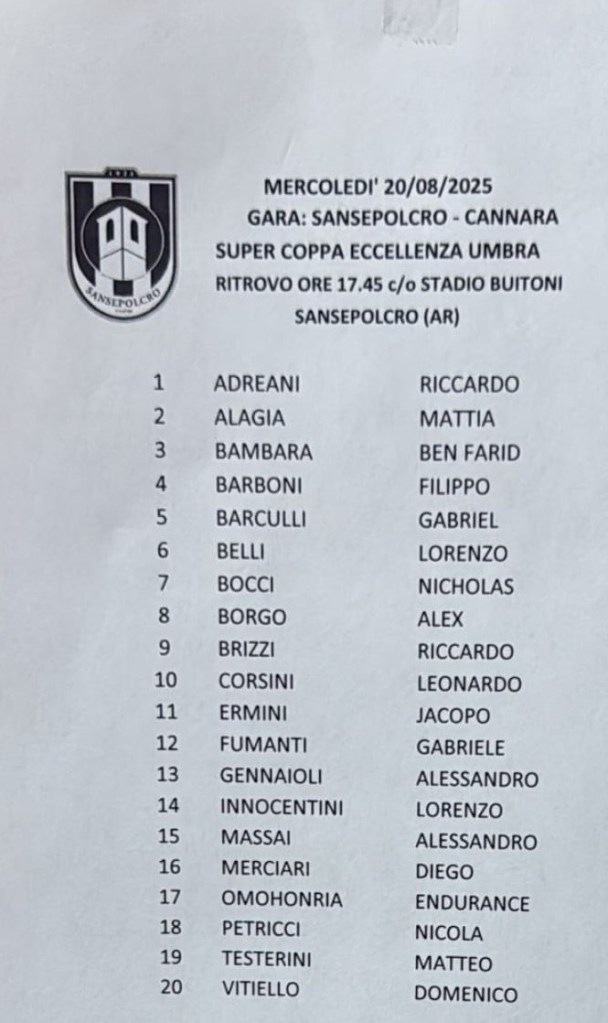 E’ arrivato il gran giorno e il Sansepolcro affronta per la quarta volta il Cannara dopo aver vinto tutti e tre i precedenti incontri: 1-0 e 2-1 in Campionato e 1-0 in Coppa Umbra. Quella di stasera, mercoledì 20 agosto in un rimesso a nuovo Stadio Bernicchi di Città di Castello, alle 20,30, è l’ennesima sfida tra le due compagini. Nel Sansepolcro infortunati Pasquali e Salis con Ciampelli che ha lasciato a casa anche i fuori quota Cirignoni, Paoli e Tilli. Dall’altra parte l’ex Armillei, oltre al portiere Vassallo, per sconfiggere un vero e proprio tabù. Il Sansepolcro aveva, sotto la guida di Armillei, vinto tutto, proprio a spese del Cannara e non poteva giocare contro se stesso per questa Super Coppa Umbra, per cui l’avversario è ovviamente il Cannara, con la sfida che si inserisce prima dei preliminari di Coppa Italia. Un fattore importante riguarda le ammonizioni e le espulsioni che andranno scontate nel prossimo campionato che prenderà il via domenica 7 settembre. Arbitra Temperoni di Terni. Si chiude un ciclo, se ne apre un altro.