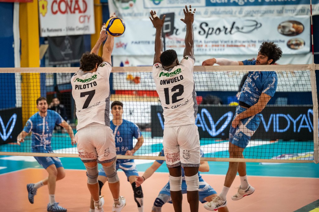 SABAUDIA. Stufano 4, Mariani 2, Panciocco 14, Pilotto 7, Schettino, Nasari 1, Onwuelo 14, Soncini 1, Rondoni (L) ricez. 38%, Serangeli, De Vito. All. Stefano Beltrame e Guido Frostino.