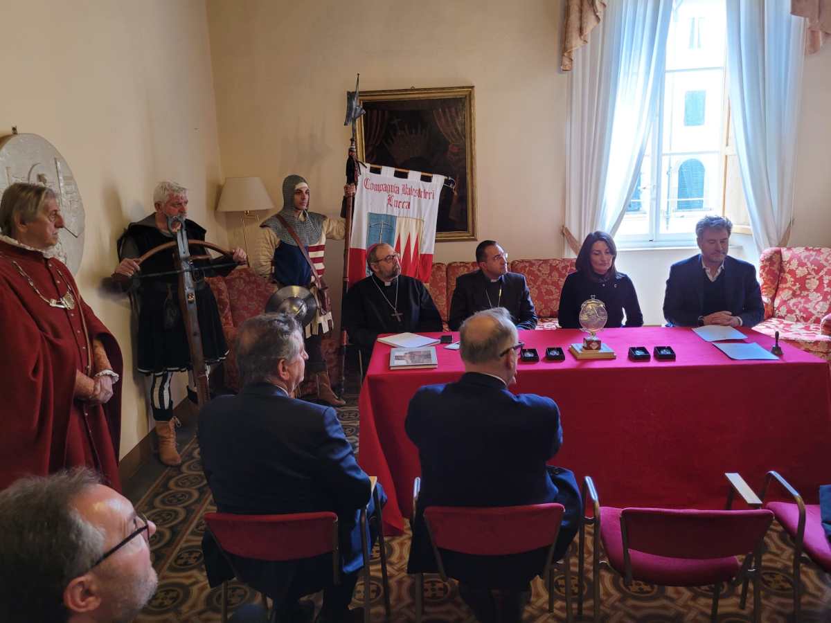 IERI MATTINA PRESSO LA CURIA VESCOVILE DI LUCCA, SI È SVOLTA LA CONFERENZA STAMPA DI PRESENTAZIONE DELLA SECONDA EDIZIONE DELL’IMAGO DEI. ALLA PRESENZA DELL’ARCIVESCOVO DI LUCCA MONS. GIULIETTI, DEL VESCOVO DI AREZZO MONS. MIGLIAVACCA, DEL SINDACO DI LUCCA PARDINI E DELL’ASSESSORE ALLA CULTURA DEL COMUNE DI SANSEPOLCRO MERCATI, SI È PARLATO DELL’UNICITA’ ED IMPORTANZA DEI DUE CROCIFISSI UNICI AL MONDO, CHE UNISCONO LE CITTÀ DI LUCCA E SANSEPOLCRO, SOTTOLINEANDO COME LE DUE SOCIETÀ BALESTRIERI HANNO SAPUTO VALORIZZARE QUESTI ANTICHI TESORI, MOLTO VENERATI NELLE DUE CITTÀ, PER TORNARE A BALESTRARE INSIEME.