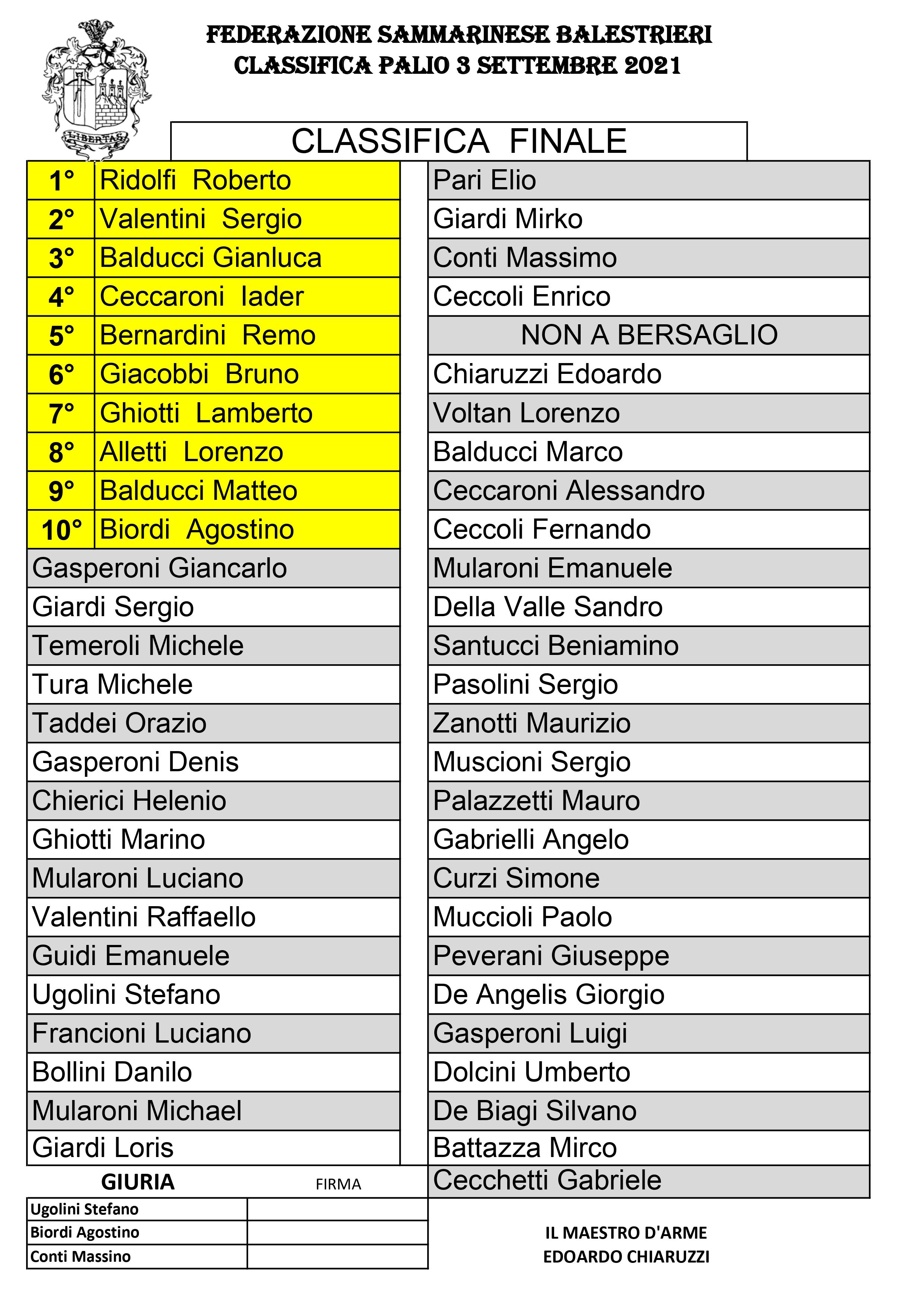 La grande Festa nella Repubblica di San Marino per i festeggiamenti della più antica Repubblica al mondo, 1721 anni dalla data di fondazione, ha visto tra i protagonisti il Torneo delle Balestre grandi che è andato, davanti agli Eccellentissimi Capitani Reggenti, a Roberto Ridolfi primo tiratore nella Cava dei Balestrieri e vincitore di tante sfide, che ha preceduto un altro esperto campione, Sergio Valentini già vincitore del Palio del 3 settembre. Questa la classifica finale: