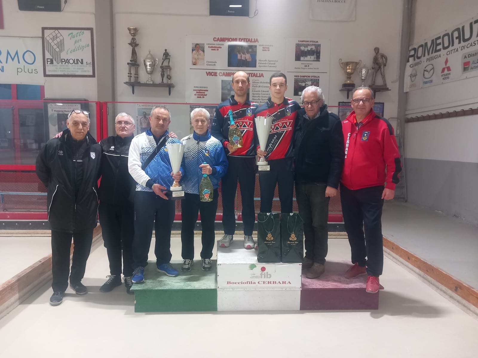 Nella foto: le prime due coppie classificate, il direttore di gara, il presidente FIB Umbria, Umbro Brutti e il presidente della bocciofila organizzatrice, Paolo Bettacchioli