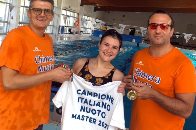 La nuotatrice Chiara Fucini è stata premiata per l’oro negli 800 stile libero e per il bronzo nei 400 stile libero vinti ai Campionati Italiani Master 2021. L’atleta della Chimera Nuoto Arezzo ha ricevuto la doppia medaglia dalla federazione e ha così festeggiato questo traguardo al palazzetto del nuoto di Arezzo insieme ai tecnici e ai compagni di squadra, potendo archiviare nel migliore dei modi una stagione particolarmente ricca di vittorie e di soddisfazioni