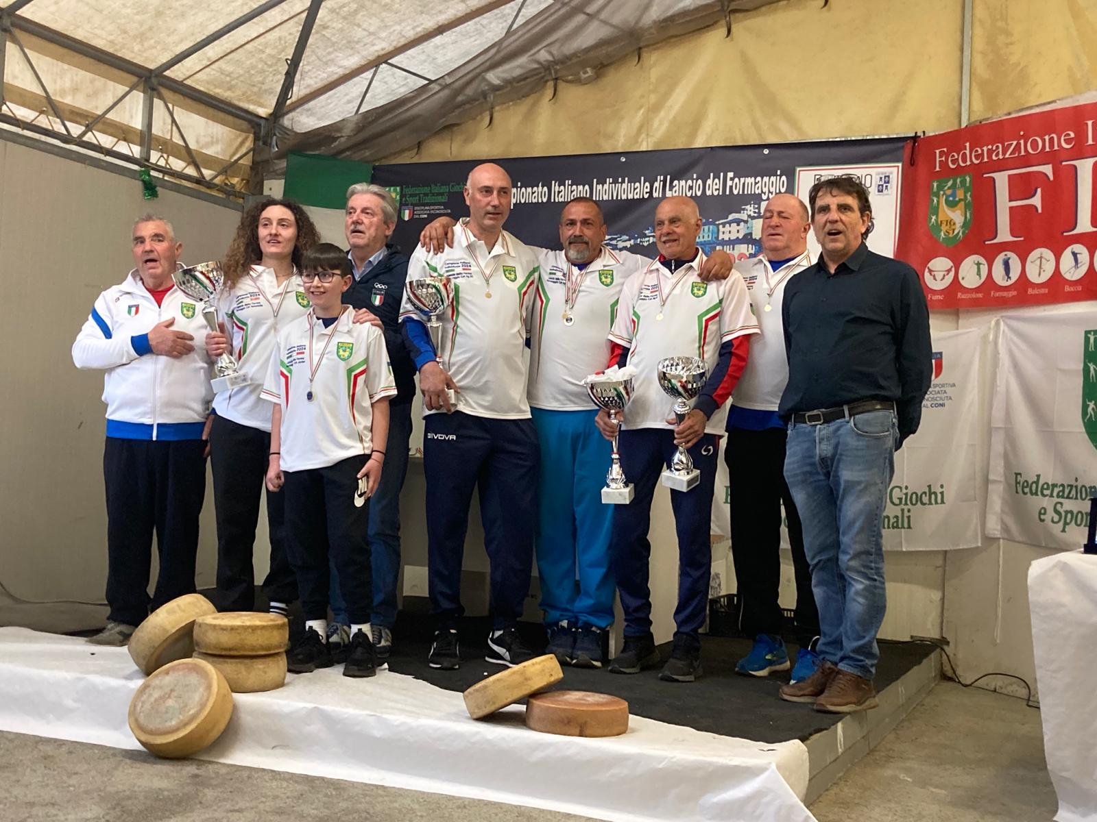 I lanciatori tifernati di forme di formaggio sul podio nazionale: incetta di titoli e medaglie ai recenti campionati italiani con due titoli tricolori, piazzamenti di riguardo e per la prima volta anche con le atlete. A Rignano sull’Arno si è svolto infatti il Campionato Italiano del lancio del formaggio FIGEST. L’associazione ASD Altotevere capitanata dal presidente Norberto Petricci ha partecipato con una folta rappresentanza che ha conseguito risultati eccezionali nelle principali categorie di gioco. Gli atleti tifernati hanno partecipato alle gare delle categorie kg 1, kg 3, kg 6 e kg 9 maschili e categoria 3 kg femminile. Nella categoria 9 kg il veterano Sauro Martinelli è il nuovo campione italiano. Nella categoria 6 kg campione italiano Massimo Giordani, secondo classificato Domenico Nardi. Nella categoria 3 kg quinto posto per Valter Carletti che ha partecipato anche alle gare per la categoria 1 kg piazzandosi al quarto posto. Infine nella categoria 3 kg femminile terza classificata Memé Pamela. Il prossimo appuntamento con le gare di lancio del formaggio sará il 27 Aprile a Petrignano d’Assisi per il campionato italiano a coppie. Alla pluridecorata delegazione tifernate e al presidente della ASD Altotevere Norberto Petricci sono giunte le più sentite congratulazioni del sindaco tifernate Luca Secondi e dell’assessore allo sport, Riccardo Carletti.