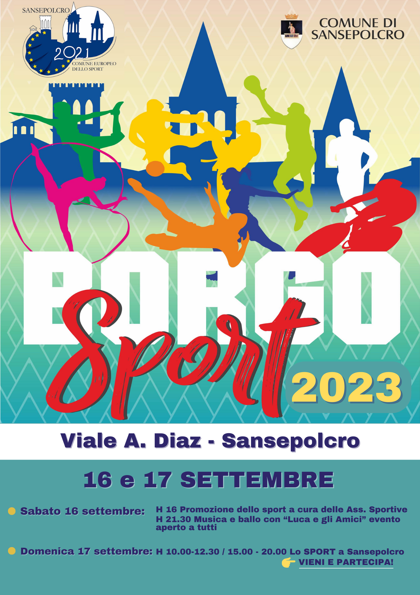 Sabato 16 e domenica 17 settembre: sport e benessere nel fine settimana di Sansepolcro in cui ha avuto successo la manifestazione che ha esaltato e celebrato le associazioni sportive del territorio. Dalla pallavolo alla danza, dal tennis alla ginnastica artistica passando per il ciclismo e la zumba assieme a tantissime altre attività sportive che sono state protagoniste di Borgo Sport, dal calcio, al volley, al basket, iniziativa del Comune di Sansepolcro che ha dato modo alle realtà locali di mettersi in mostra ed esibirsi per promuovere le proprie iniziative lungo viale Diaz, a Porta Fiorentina.